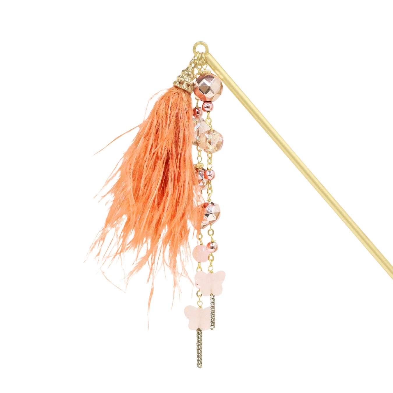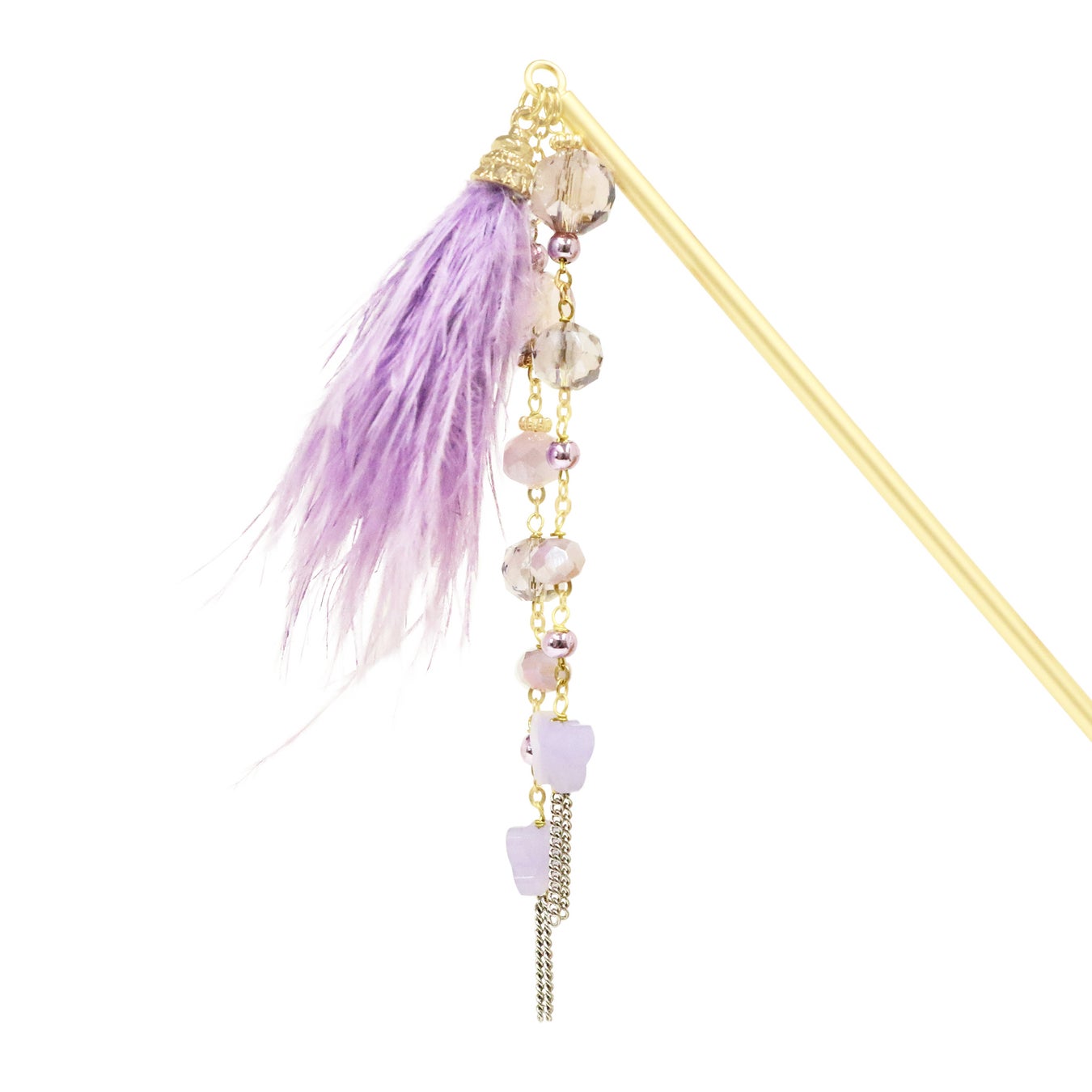 光を受けて煌めく装飾と、柔らかな羽のボリュームが絶妙に調和し、ヘアスタイルを華やかに彩ります。軽やかに揺れる羽が上品な動きを生み出し、身につけるだけで華やかさを引き立てます。