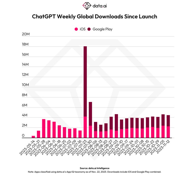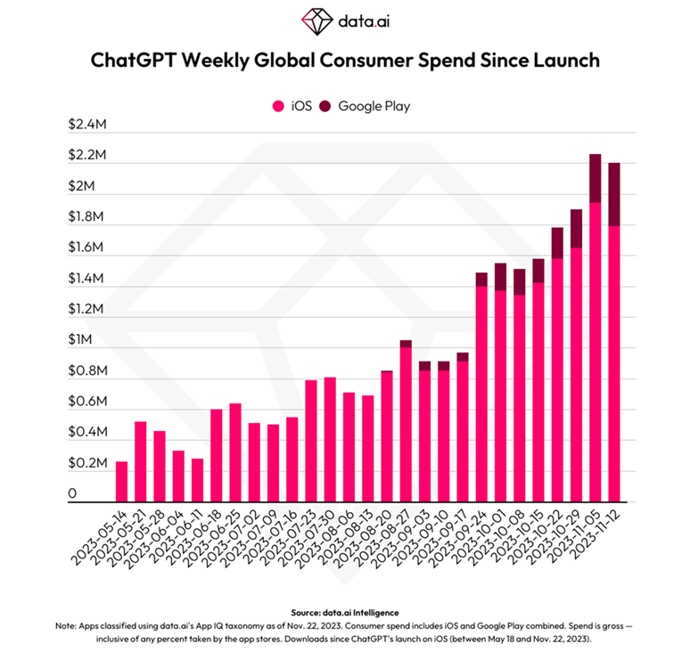 AI自体は私たちにとってもはや目新しいものではないかもしれませんが、一般消費者にとって、OpenAIのこの発明は衝撃的でした。ChatGPTがウェブで公開されてから6ヶ月後にiOS向けのモバイルアプリがリリースされ、その2ヶ月後には、Google Play版もリリースされました。1周年を迎えたChatGPTが提供するモバイルアプリは、全世界で1億1,000万回以上ダウンロードされ、月額サブスクリプションでは世界で約2,860万ドル消費支出を生み出しています。