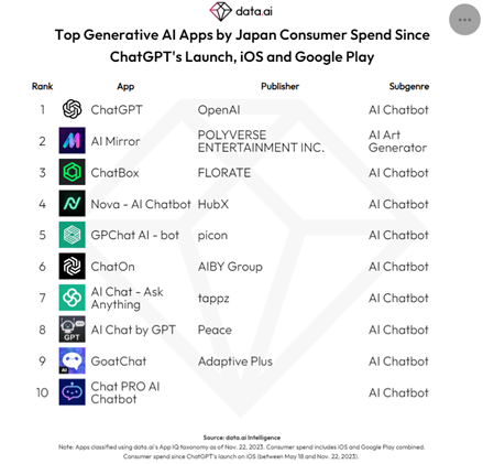あるほか、プレミアムとエリートの2つのプランを用意するなど、幅広い課金オプションをユーザーに提供しています。なお、日本においてはChatGPTが消費支出額で首位となっています。