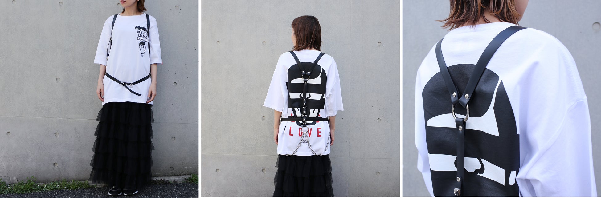 手ぶらコーディネイトに便利な、インパクトのあるラバー製のボディーアクセサリー。首回りのチョーカータイプ/胴回りのハーネスタイプ/腿回りのガータータイプの3種類を展開。リングカラビナを多用することで、拡張性能に加えて、ミニポーチや、ミニケースを自由に取り付けることが可能です。ボンテージパンクの攻撃的な印象を、ラバーを使用することでやさしく抑え、カジュアルに身に着けやすいデザインに。