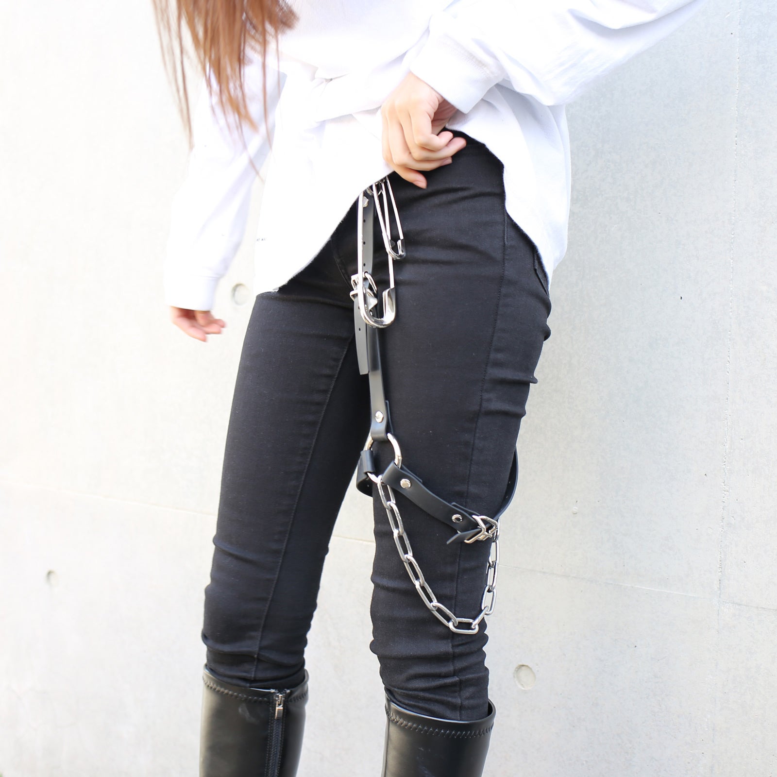ボンテージ風パンクファッションを現代的にソフトにアップデートしたラバー素材のチョーカー、ハーネス、ガーターベルトには、スマホやポーチなどを取り付けることが可能なので、身軽な手ぶらスタイリングにも役立ちます。