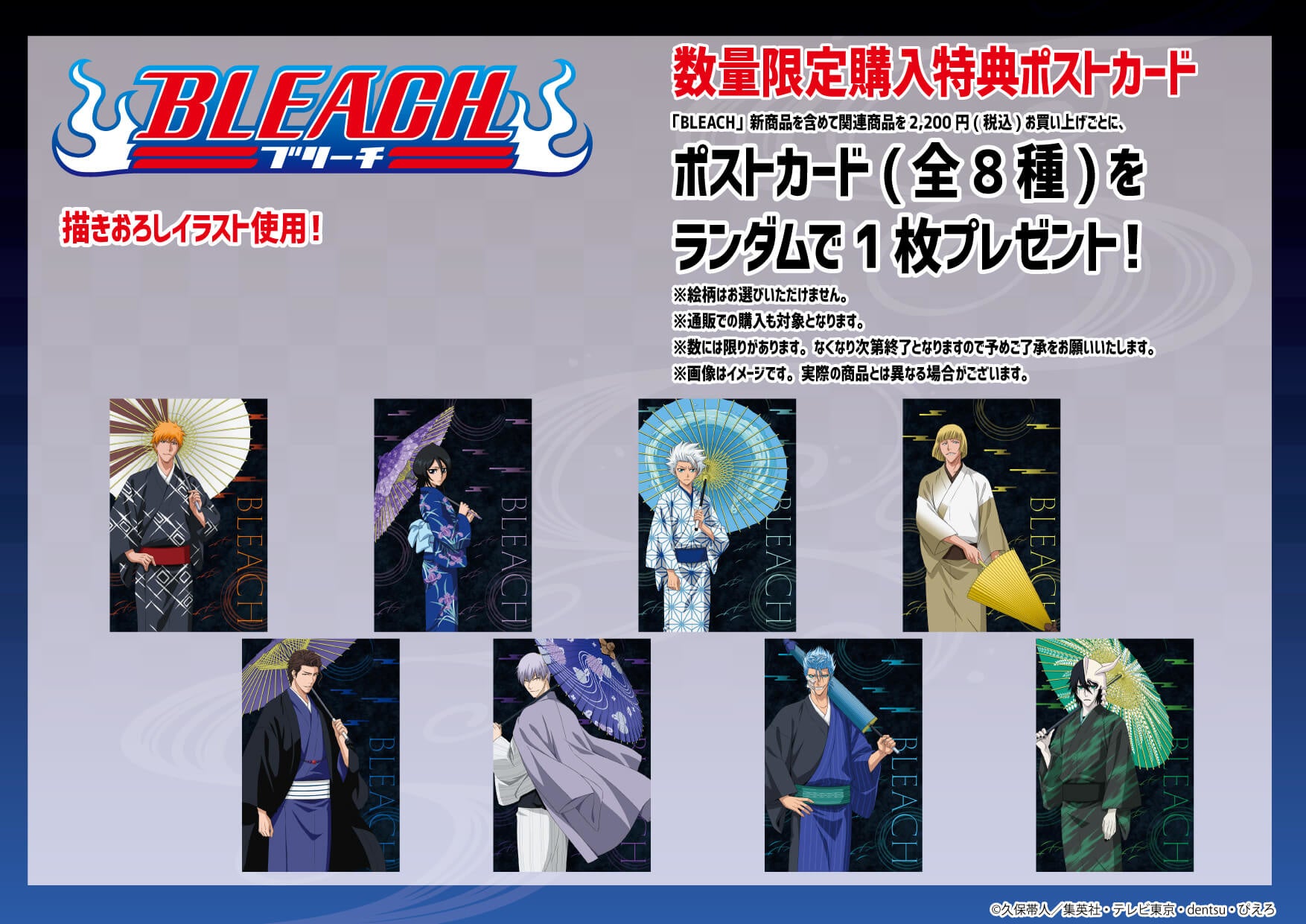 TVアニメ『BLEACH』の新商品含め関連商品を税込みで2200円以上お買い上げごとに、8種類のうち1枚をランダムでお渡しします。
