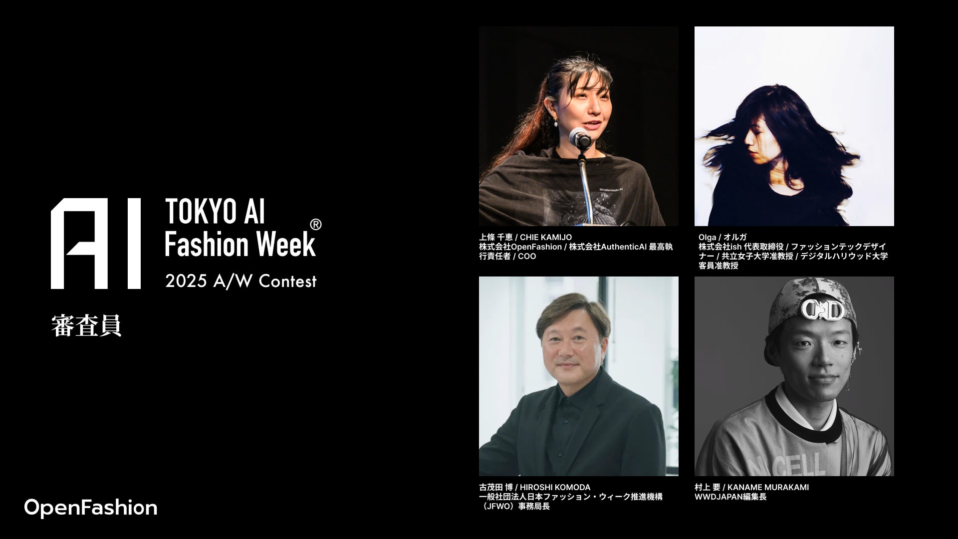 ファッションと生成AIをはじめとした最新テクノロジーをかけ合わせたサービス・プロダクトの開発に取り組む株式会社OpenFashion(本社:東京都港区、代表:上田 徹、以下OpenFashion社)は、生成AIを活用したファッションデザインコンテスト「TOKYO AI Fashion Week - 2025 A/W Contest」の特別審査員に、WWDJAPAN編集長 村上 要氏、ファッションテックデザイナーのOlga(オルガ)氏、そして一般社団法人日本ファッション・ウィーク推進機構(以下JFWO)事務局長の古茂田 博氏が決定したことをお知らせします。