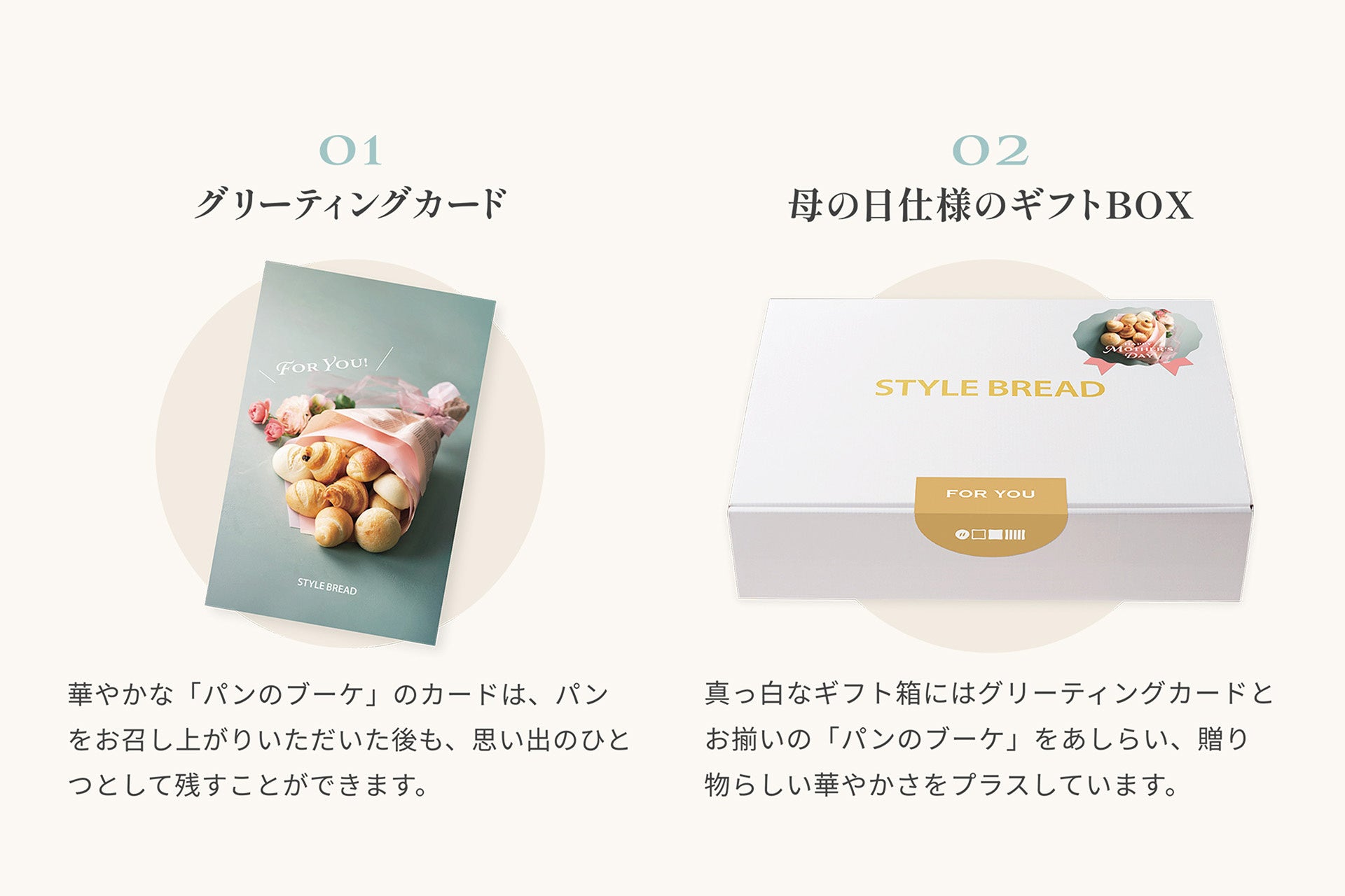 また、パッケージは、シールや同梱されているグリーティングカードにブーケがあしらわれた母の日限定仕様。母の日にお花を贈るように、パンを贈る文化を広げていきたいという想いを込めたデザインになっています。