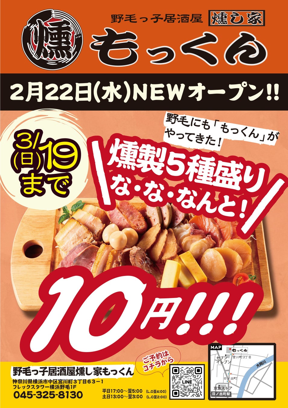 吉祥寺の人気店『燻し家もっくん』が初の横浜上陸!「のんべぇの街」で知られる野毛にて、オープン記念として燻製5種盛りを味見価格の10円で提供!