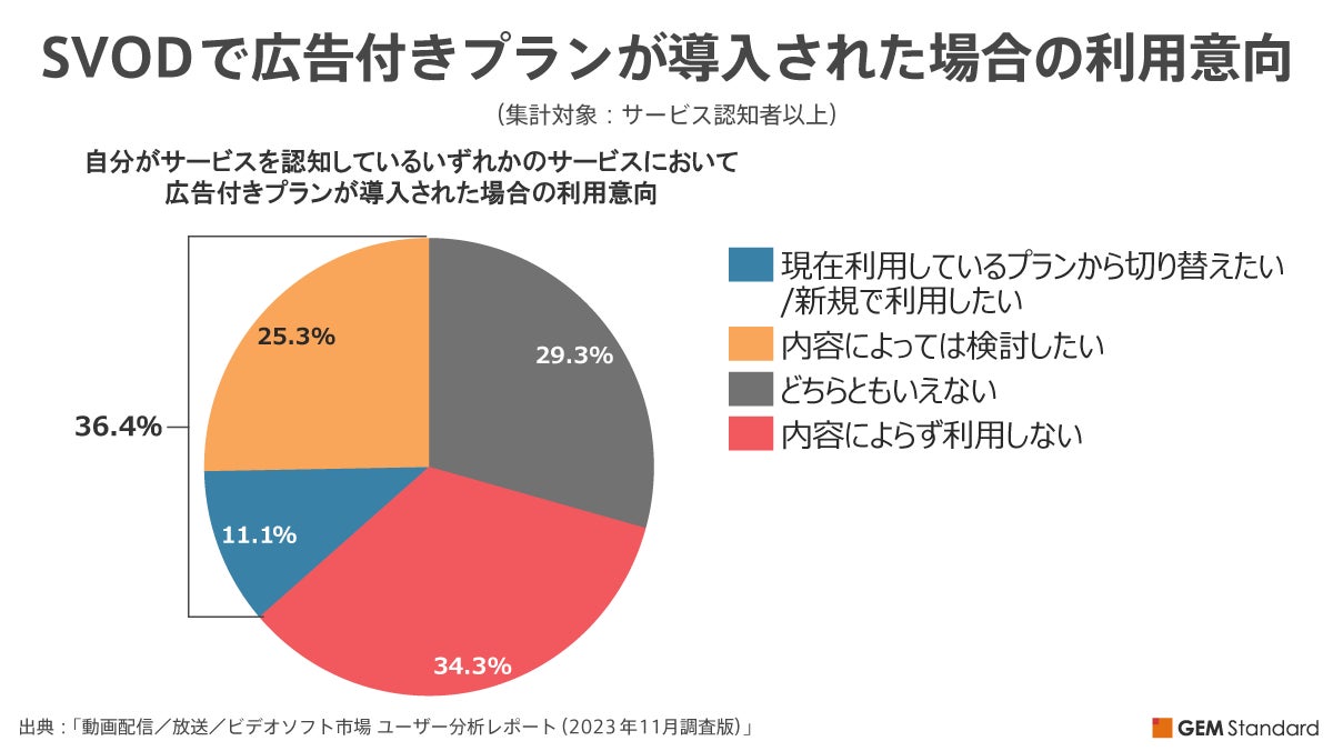 各SVODのサービス認知者以上に対して、自分が認知しているいずれかのサービスにおいて、広告付きプランが導入された場合の利用意向を調査したところ、「現在利用しているプランから切り替えたい/新規で利用したい」が11.1%、「内容によっては検討したい」が25.3%となり、広告付きプランに前向きな意向を示したユーザーは36.4%となりました。一方で「内容によらず利用しない」と否定的な意向を示したユーザーは34.3%となりました。