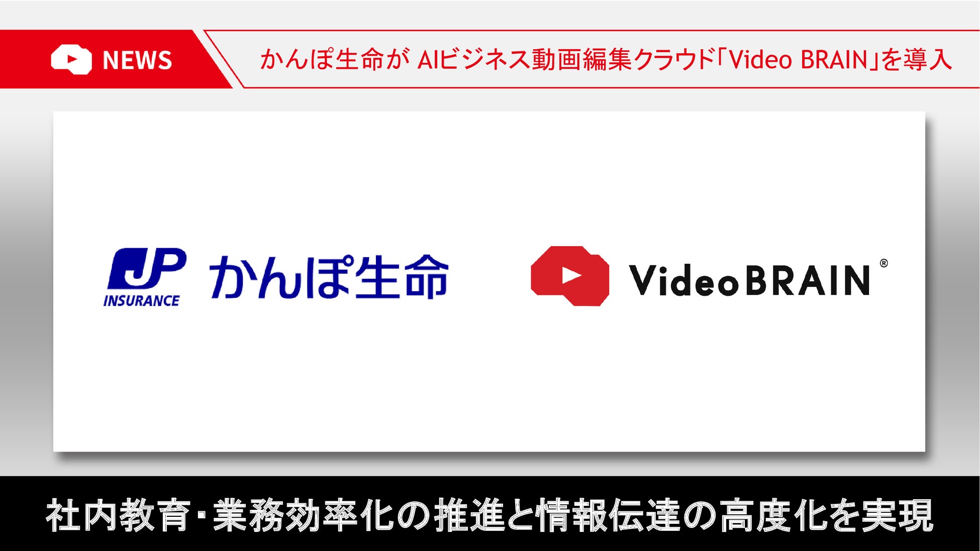 株式会社オープンエイト(本社:東京都千代田区、代表取締役社長兼 CEO 髙松 雄康、以下「オープンエイト」)が提供するAIビジネス動画編集クラウド「Video BRAIN」が、株式会社かんぽ生命保険(東京都千代田区、取締役兼代表執行役社長 谷垣邦夫、以下「かんぽ生命」)に導入されることが決定しました。