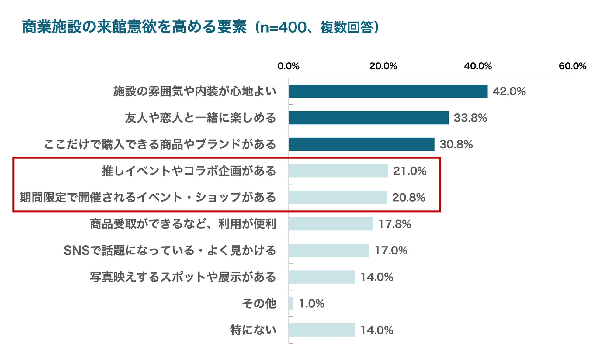 来館意欲を高める要因は「施設の雰囲気や内装が心地よい」(42.0%)が最多。一方、「推しイベント・コラボ企画」、「期間限定のイベント・ショップ」が2割を占め、“今しか体験できない特別感”が今後の動機づけに寄与。