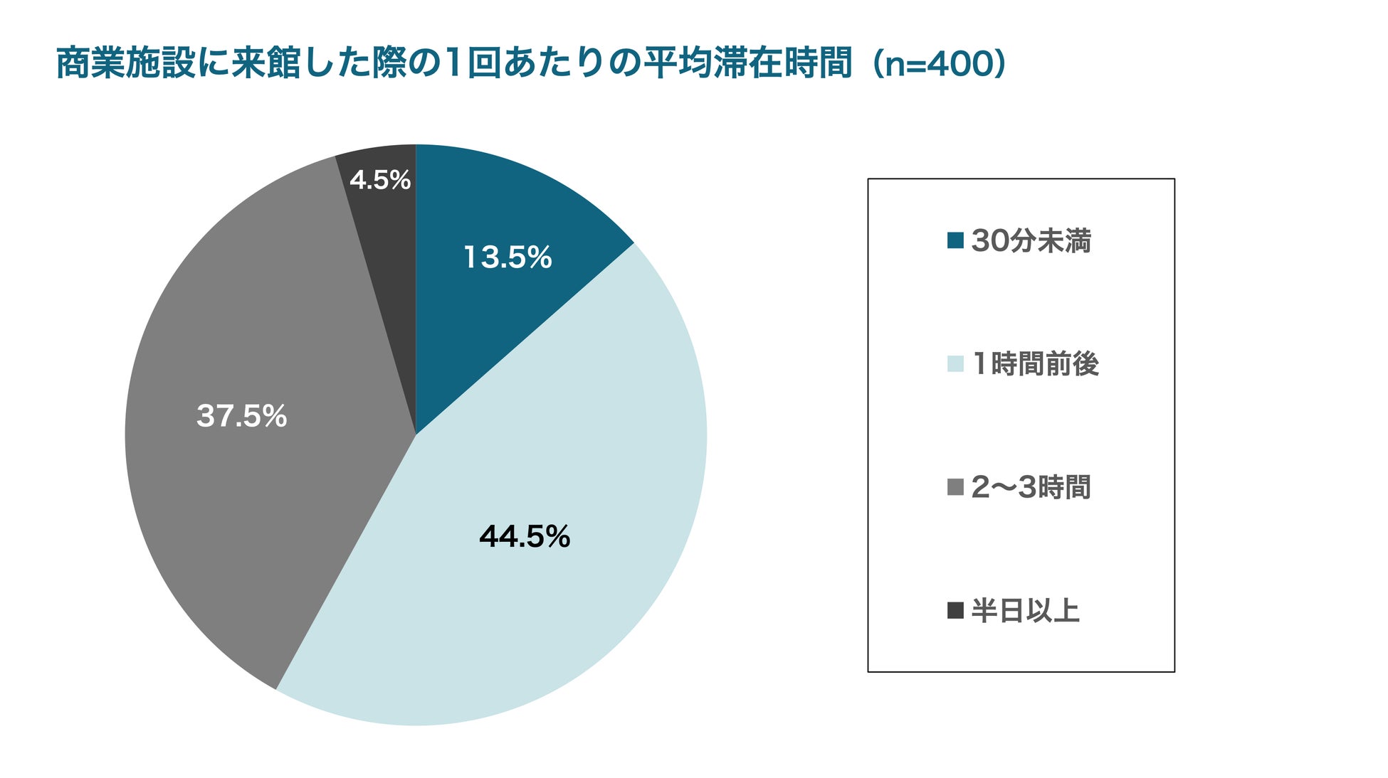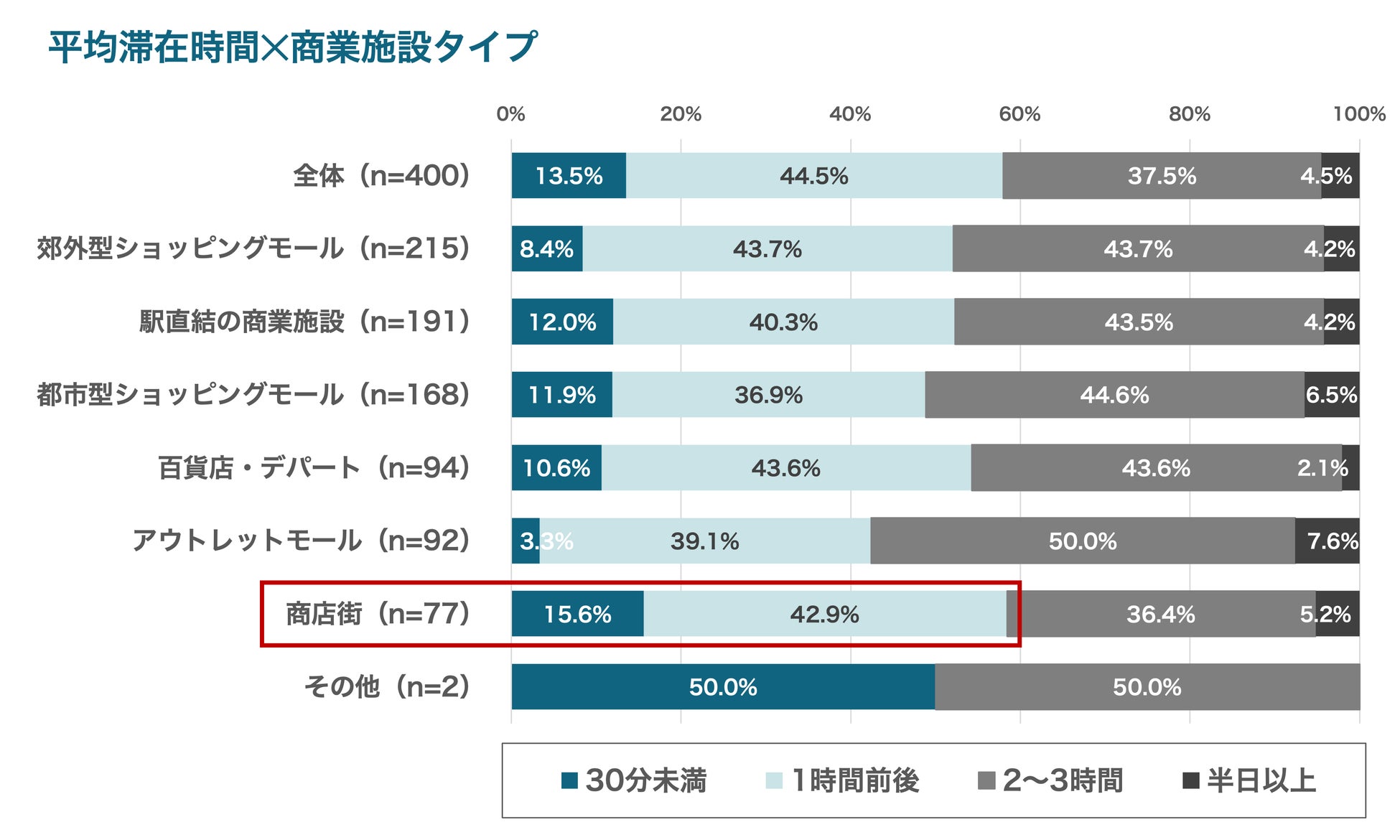 加えて館種別で平均滞在時間をみると、「商店街」は短時間利用(“30分未満”、“1時間前後”の合算)が58.5%と最も高く、“サクッと立ち寄る”利用が中心であることがわかりました。一方、「アウトレットモール」では“2〜3時間”の滞在が相対的に高く、滞在を楽しむ目的地型の傾向が見られました。
