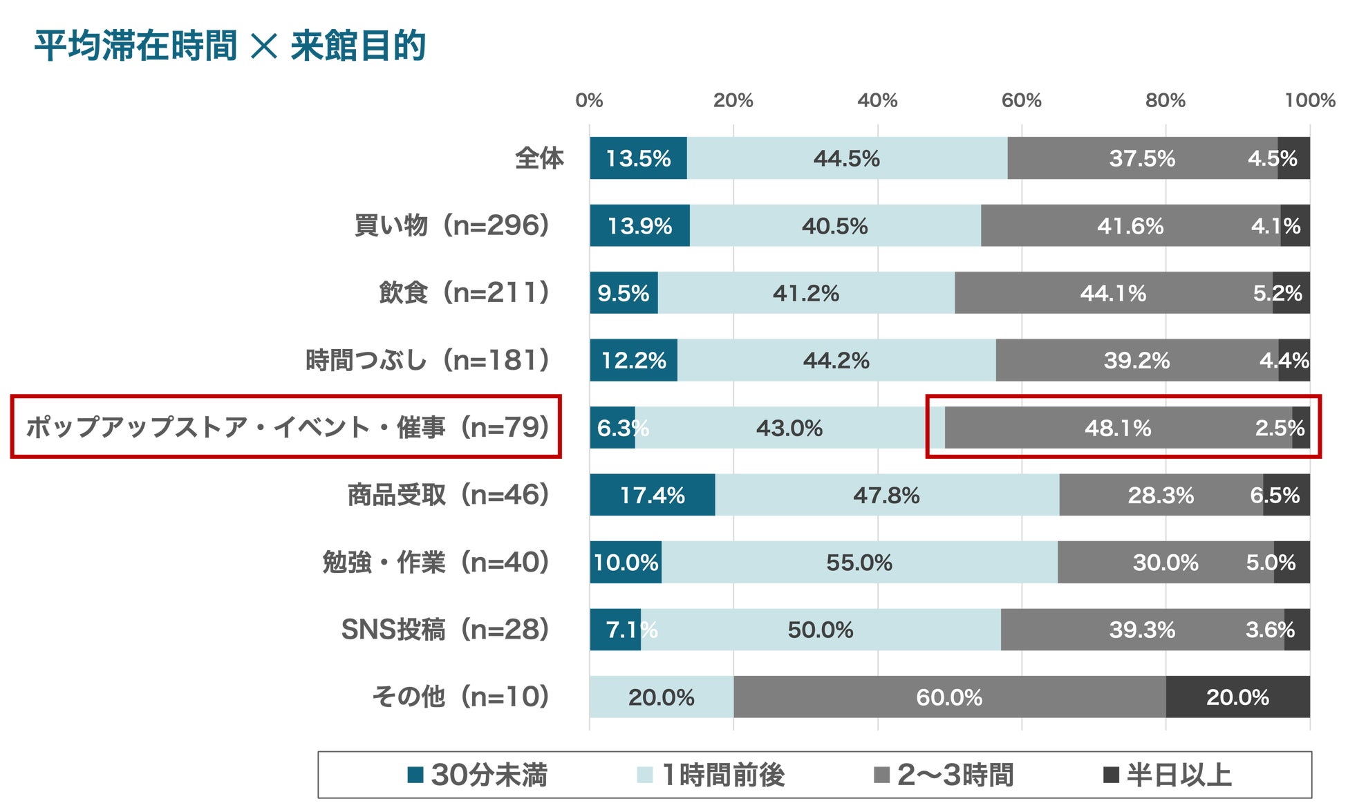 来館目的別に平均滞在時間をみると、「ポップアップストア・イベント・催事」は長期滞在の割合が全体平均と比較しても相対的に高く(“2〜3時間”、“半日以上”の合算)、体験を軸に“ゆっくり過ごす”傾向が表れました。「買い物」は目的の幅が広いせいか、短時間での指名買いと長時間の買い回りの双方が混在する“二極型”の滞在パターンとなりました。