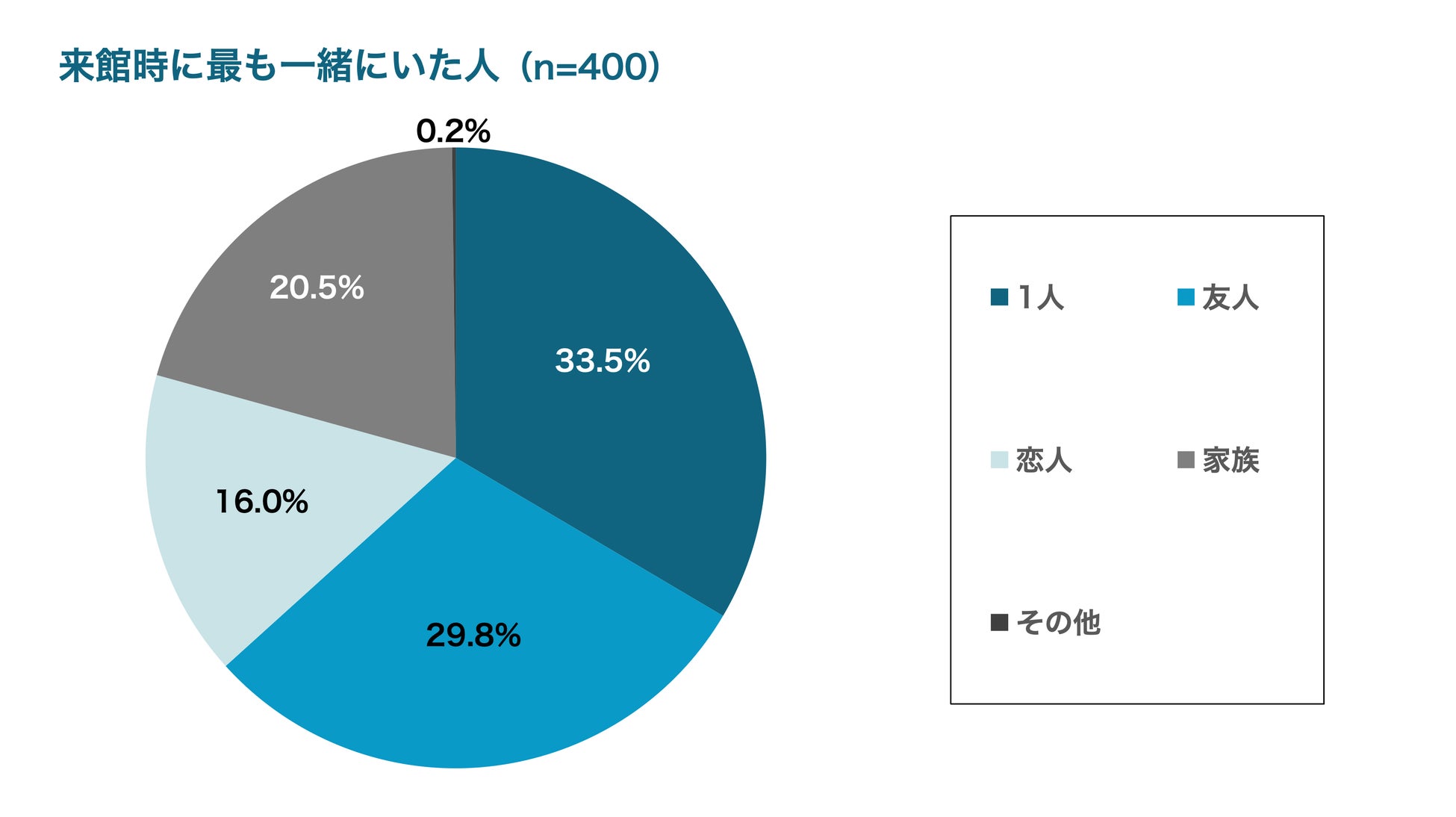 来館時、「友人」や「恋人」、「家族」など誰かしら同行者のいる割合が66.3%になり、単独来館の33.5%に比べ同伴来館が一定の比率を占める実態が確認できました。