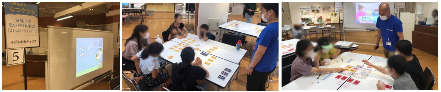 こうした状況を受け、川西阪急では、“体験”と“学び”をテーマとして取り上げたワークショップ「カードゲームで体験!子どもキャリア教育ワークショップ」を、2022年8月10日(水) 、11日(木・祝)に開催しました。ワークショップでは、キャリア教育用テーブルゲーム教材『子ども未来キャリア』を活用し、「思いやりを学ぶ コミュニケーション編」「キーワードを探せ!情報コントロール編」の2つのテーマを実施しました。