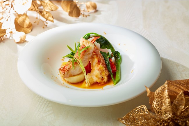 お魚料理は冬の定番の食材金目鯛と贅沢にオマール海老を香ばしく焼き上げた食べ応えのある1皿に、