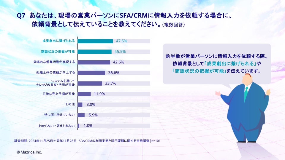 「Q7.現場の営業パーソンにSFA/CRMに情報入力を依頼する場合に、依頼背景として伝えていることを教えてください。(複数回答)」(n=101)と質問したところ、「成果創出に繋げられる」が47.5%、「商談状況の把握が可能」が45.5%、「効率的な営業活動が実現する」が42.6%という回答となりました。