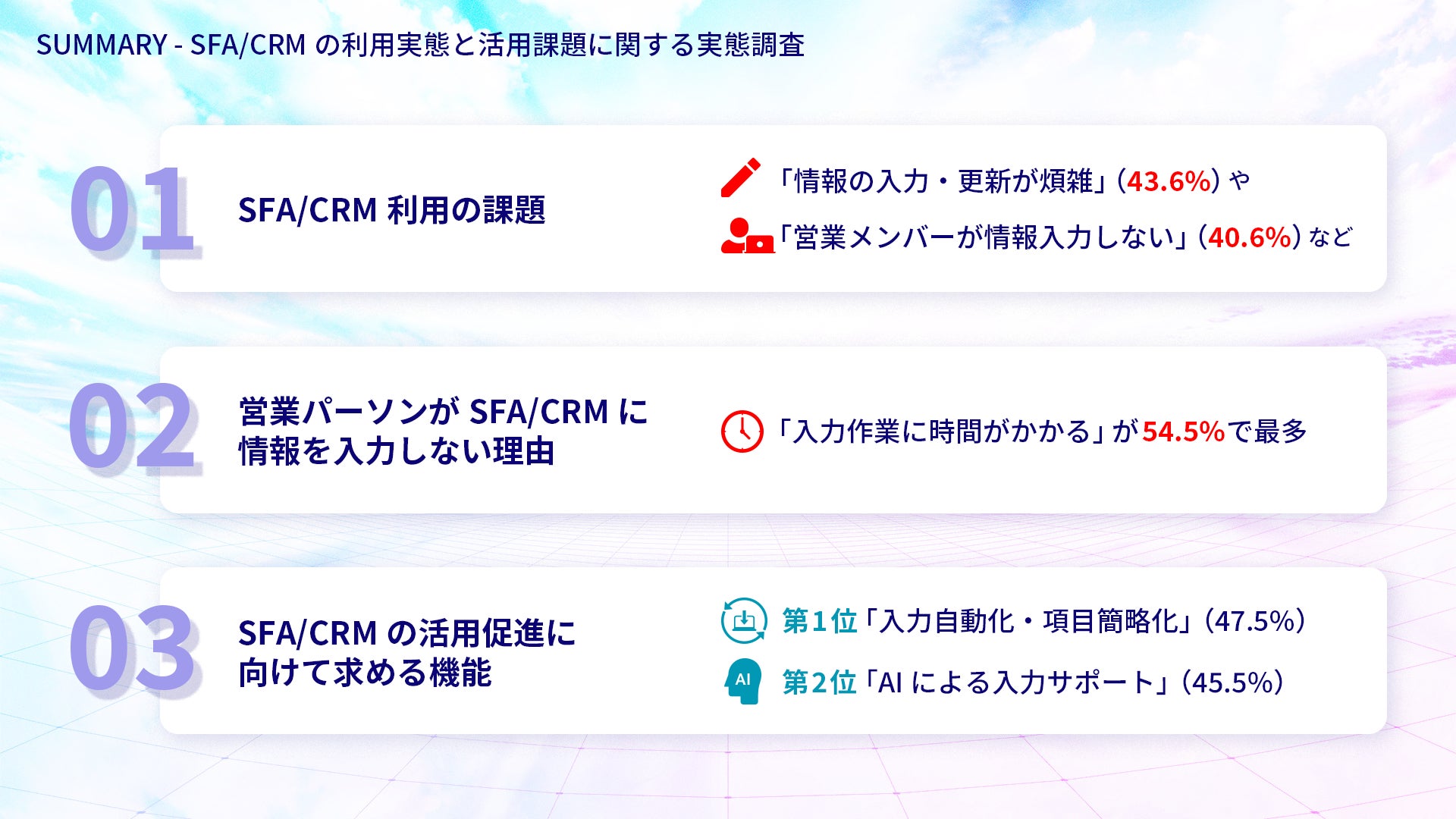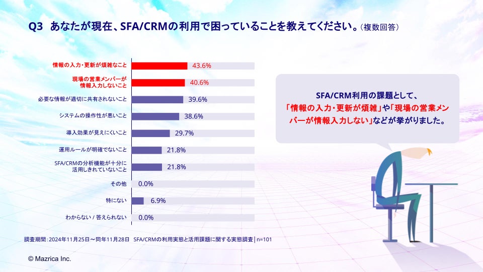 01|SFA/CRM利用の課題、「情報の入力・更新が煩雑」(43.6%)や「営業メンバーが情報入力しない」(40.6%)など