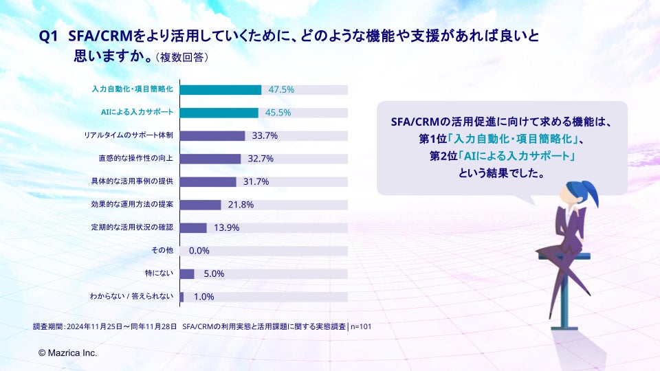 「Q1.SFA/CRMをより活用していくために、どのような機能や支援があれば良いと思いますか。(複数回答)」(n=101)と質問したところ、「入力自動化・項目簡略化」が47.5%、「AIによる入力サポート」が45.5%、「リアルタイムのサポート体制」が33.7%という回答となりました。