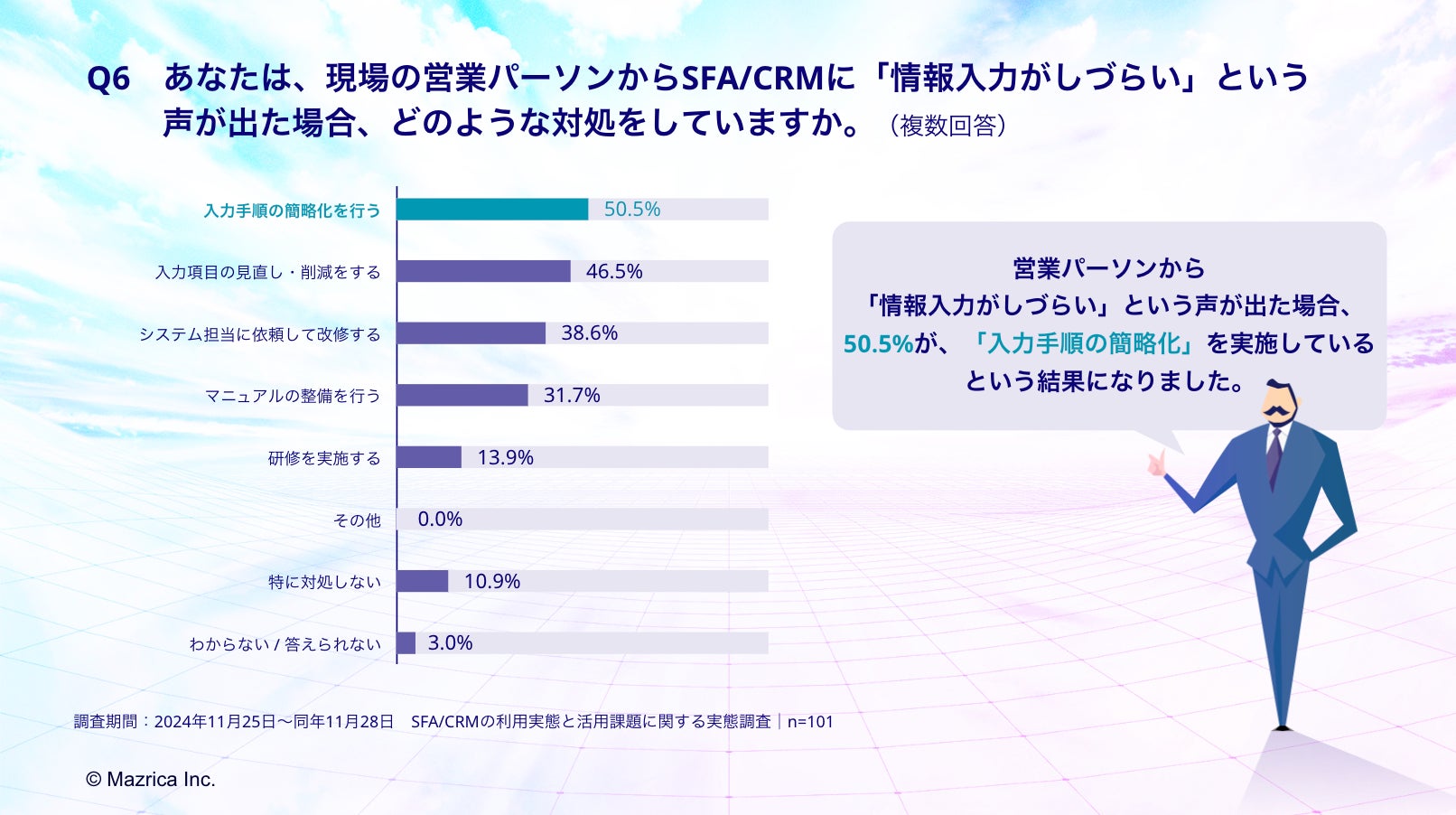 「Q6.あなたは、現場の営業パーソンからSFA/CRMに「情報入力がしづらい」という声が出た場合、どのような対処をしていますか。(複数回答)」(n=101)と質問したところ、「入力手順の簡略化を行う」が50.5%、「入力項目の見直し・削減をする」が46.5%、「システム担当に依頼して改修する」が38.6%という回答となりました。