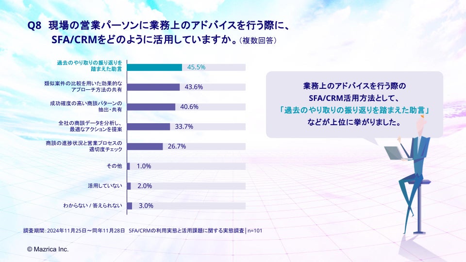 「Q8.現場の営業パーソンに業務上のアドバイスを行う際に、SFA/CRMをどのように活用していますか。(複数回答)」(n=101)と質問したところ、「過去のやり取りの振り返りを踏まえた助言」が45.5%、「類似案件の比較を用いた効果的なアプローチ方法の共有」が43.6%、「成功確度の高い商談パターンの抽出・共有」が40.6%という回答となりました。