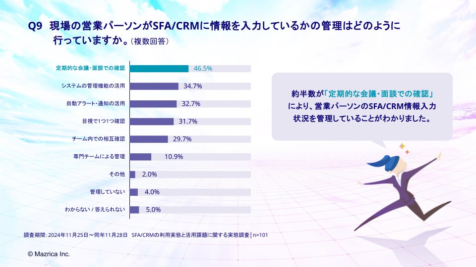 「Q9.現場の営業パーソンがSFA/CRMに情報を入力しているかの管理はどのように行っていますか。(複数回答)」(n=101)と質問したところ、「定期的な会議・面談での確認」が46.5%、「システムの管理機能の活用」が34.7%、「自動アラート・通知の活用」が32.7%という回答となりました。