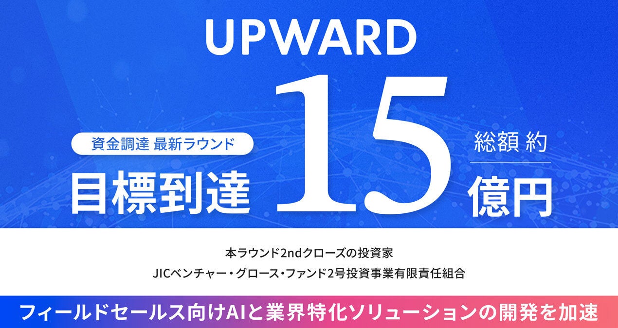 UPWARD株式会社(本社:東京都千代田区、代表取締役 CEO:金木 竜介、以下 UPWARD)は、新規投資家のJICベンチャー・グロース・インベストメンツ株式会社(本社:東京都港区、代表取締役社長CEO:鑓水 英樹)が運営する JICベンチャー・グロース・ファンド2号投資事業有限責任組合より出資を受け、最新ラウンドを2ndクローズしました。これにより本ラウンドの資金調達額は、目標の約15億円に到達しました。