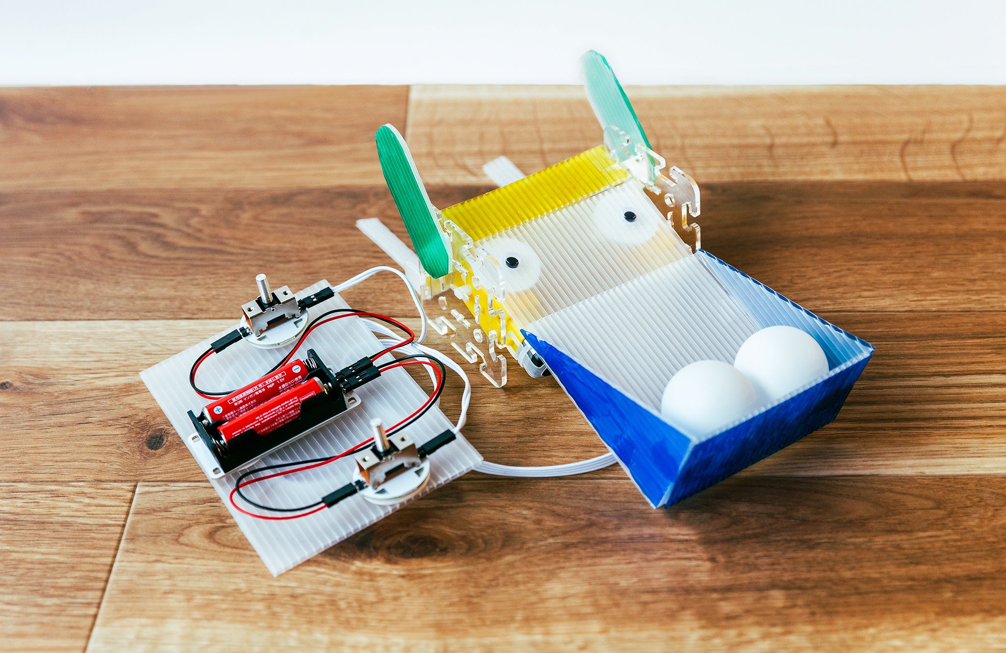 作例:プラ段ボールを加工してピンポン玉を運べるトラックにもできる。ばんのうジョイントで取り付けも簡単。