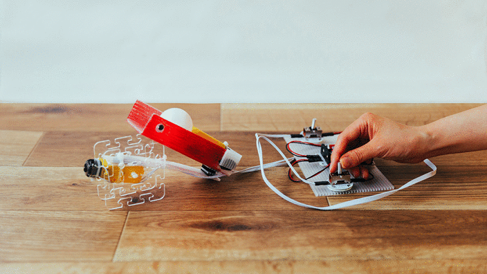 作例:まずは動かしてみよう!操縦盤とロボットを繋げて電池を入れたら、動くロボットがすぐに完成。