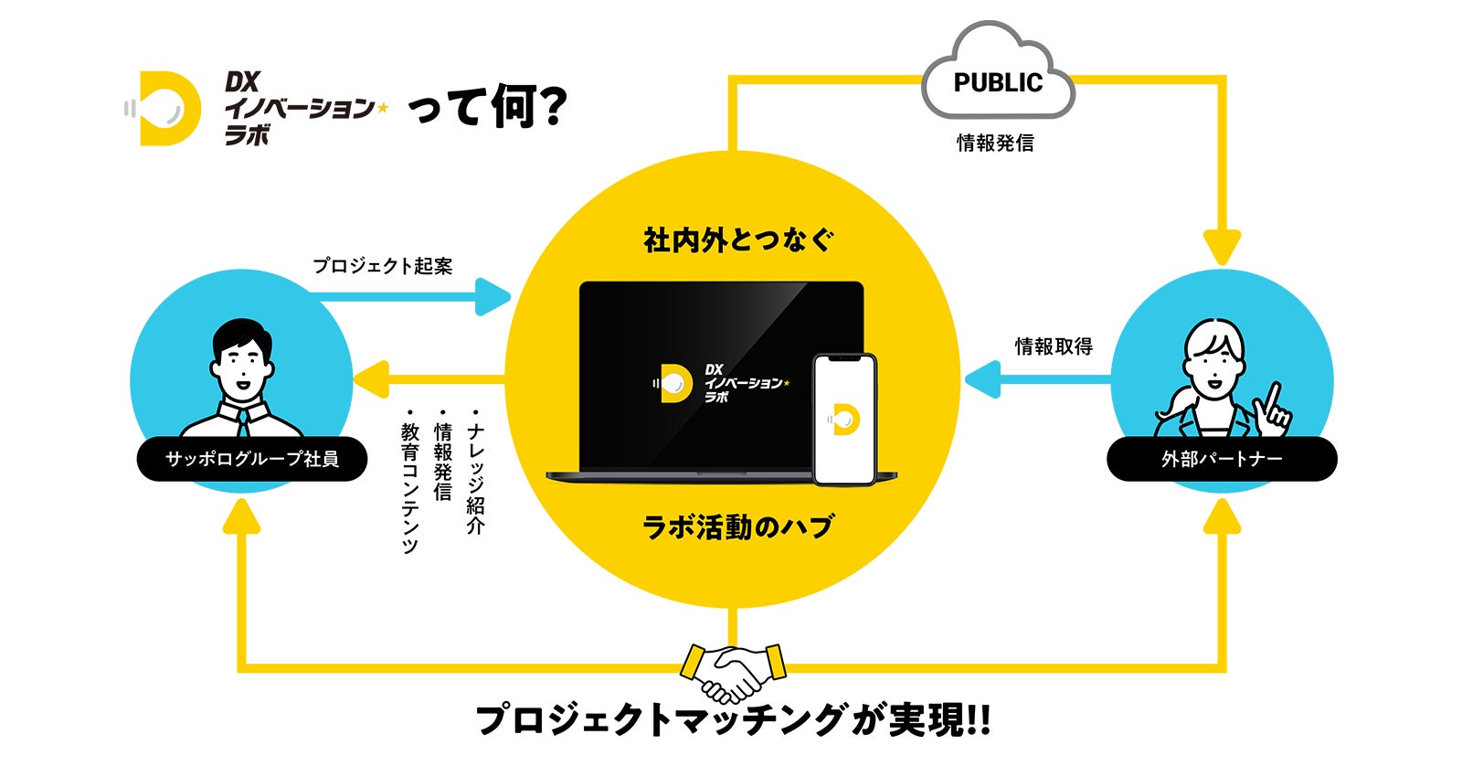 DX イノベーション★ラボは、サッポログループの社員の他、様々な業界の企業がラボパートナーとして参画し、本日開設される専用のポータルサイトを通して既存事業における課題、解決に向けた提案、新規事業のタネなどのDX企画を通して、社内外問わず共創関係を構築し検討・検証を重ねることで、大胆な業務改革や新たな事業モデルの創出につなげる構想です。