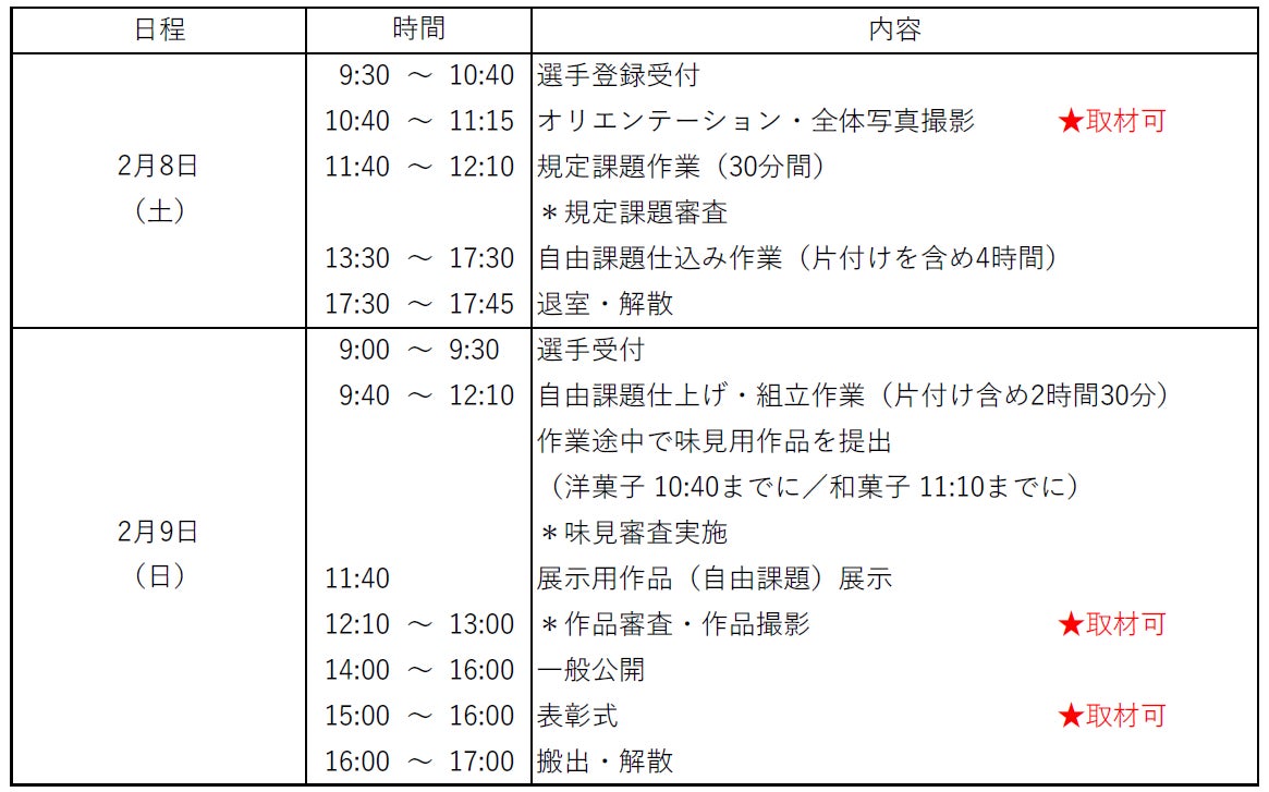 会場となる辻󠄀調理師専門学校からは、洋菓子部門2名、和菓子部門2名の学生が出場し、学びの成果を発揮するべく、日々練習を重ねてまいりました。報道関係者の皆様におかれましては、お忙しい中とは存じますが、ぜひとも全国から集まる学生たちの勇姿を見届けていただき、ご取材等賜りますよう宜しくお願い申し上げます。