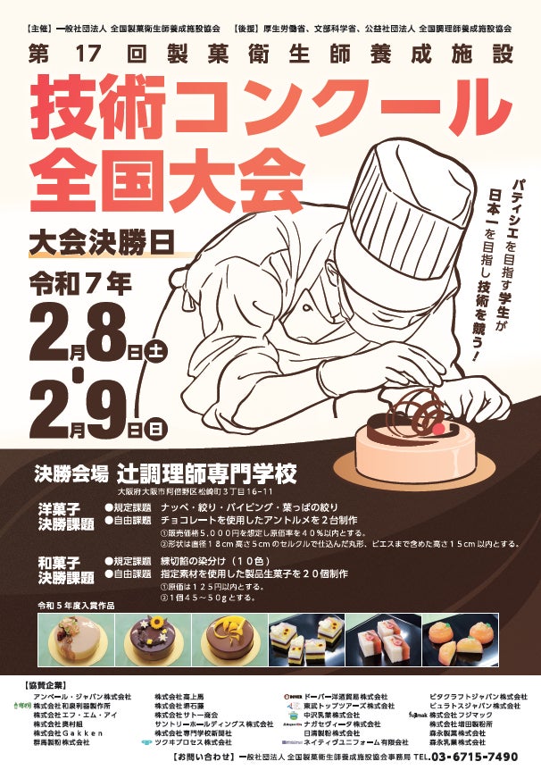 一般社団法人全国製菓衛生師養成施設協会が主催する「第17回製菓衛生師養成施設技術コンクール全国大会」が2025年2月8日(土)・9日(日)の2日間、辻󠄀調理師専門学校(大阪市)にて開催されます。