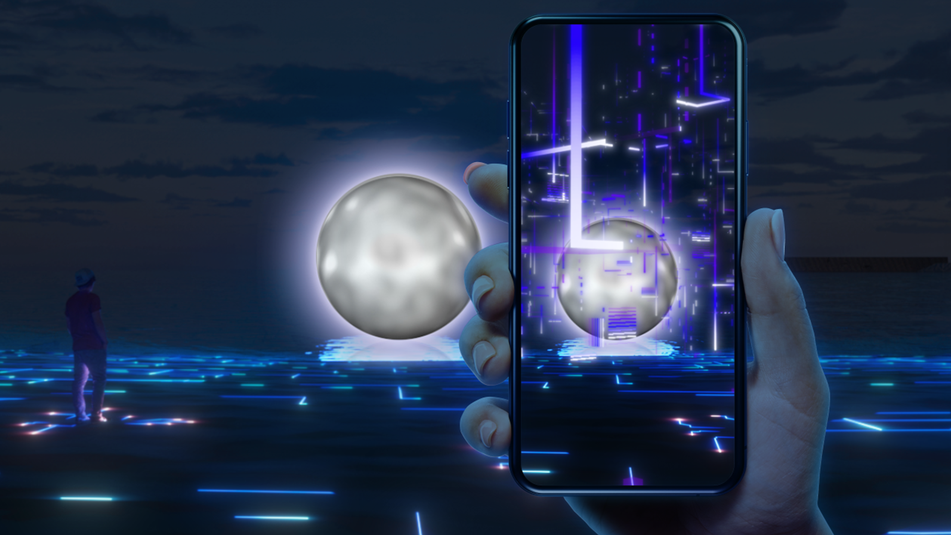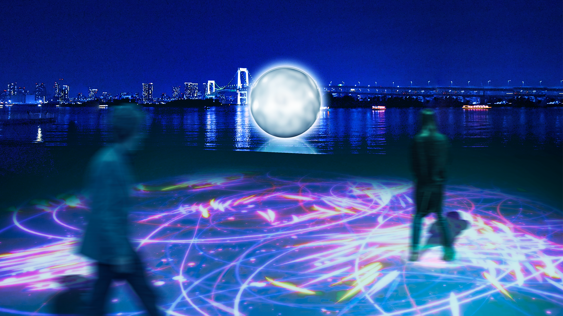 お台場の海辺に浮かぶ美しい月。さまざまな人びとに「調和」を引き寄せ、刻まれる時と共に、光と音の世界を彩っていきます。