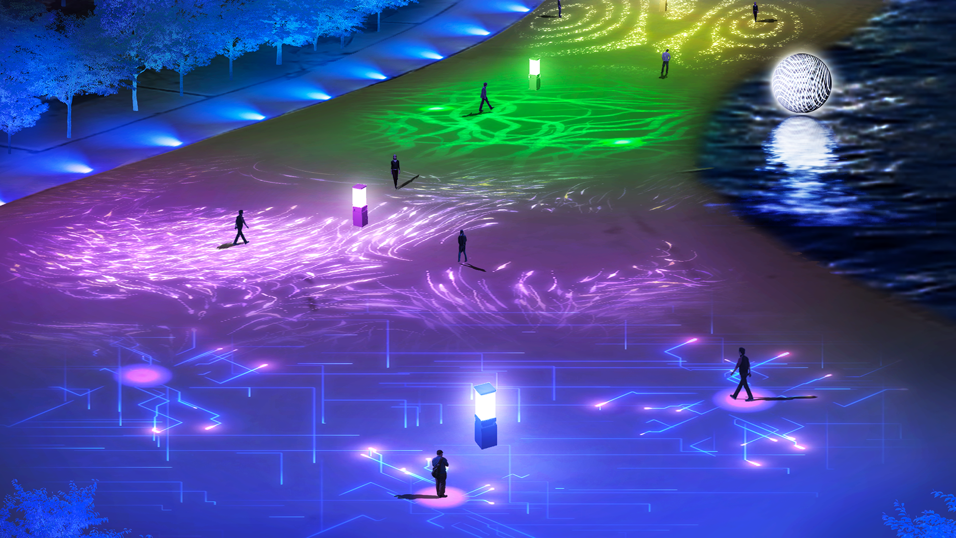 エリア内に足を踏み入れると、その動きが「調和」を奏でる譜面の一音になったかのように、「サウンド」と「光」に変化を生み出します。