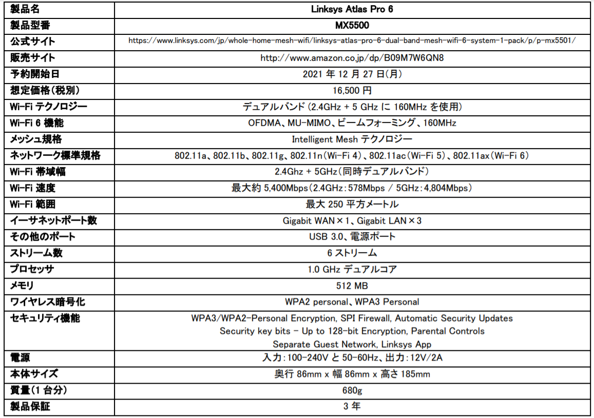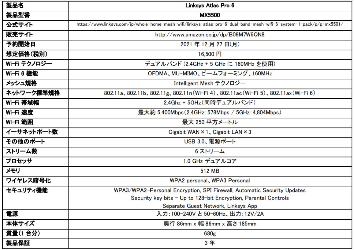 ベルキン株式会社(所在地:東京都台東区)は、傘下ブランド「Linksys(リンクシス)」より、Velop Intelligent Meshを搭載したデュアルバンドWi-Fi 6ルーターLinksys「Atlas Pro 6」を、全国の家電量販店およびAmazon.co.jpなどで2021年12月27日(月)より予約開始し、12月30日(木)以後より順次お届けいたします。