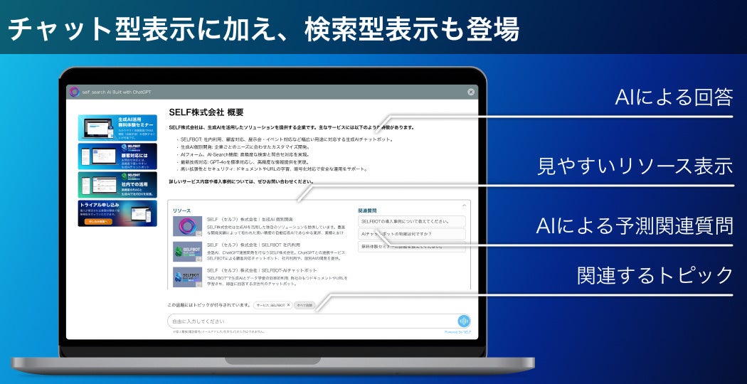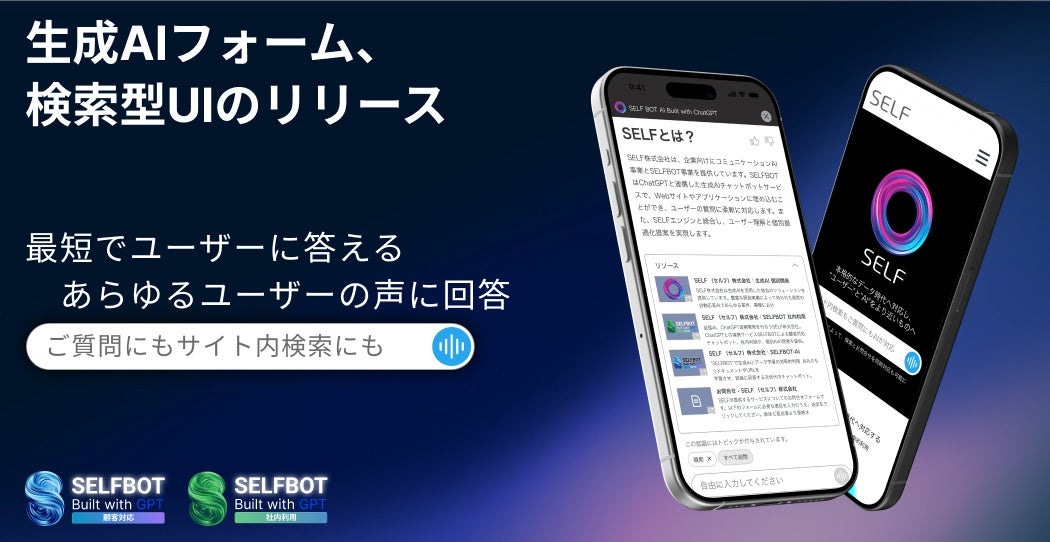 SELF株式会社(本社:東京都新宿区、代表取締役:生見臣司)は、法人向け生成AIサービス「SELFBOT」において、より生成AIの利用率を高める「AIフォーム」と「検索型UI」をリリースしました。