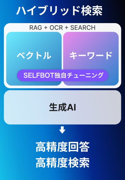これらの多様な入力形式に対応するために、SELFBOTはRAGにおける検索手法を一新。「ベクトル検索」と「キーワード検索(全文検索)」を組み合わせた「ハイブリッド検索」を採用することによって、あらゆる入力に対して精度の高い回答を出力することが可能となりました。
