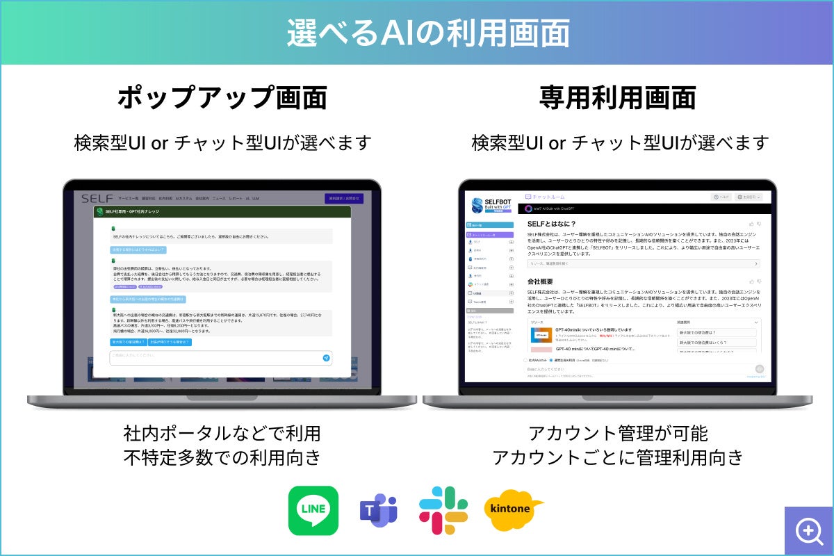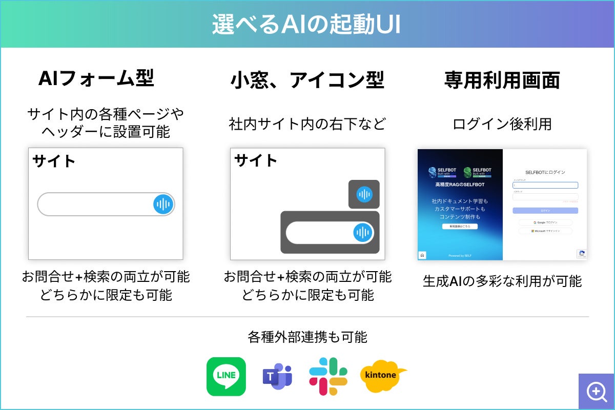 SELFBOTは、生成AI活用におけるあらゆるニーズに応えるため、幅広いUIの選択肢を備えています。