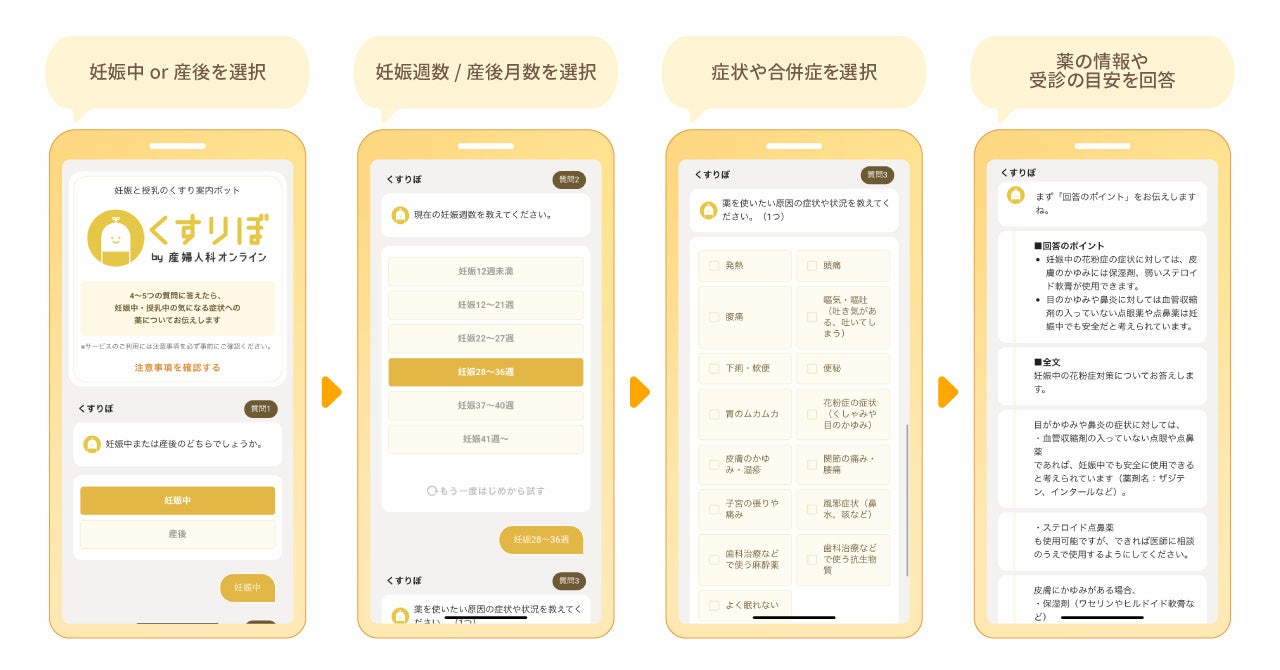 「産婦人科オンライン」「小児科オンライン」は、これまでオンライン相談により寄せられた8万件以上の相談データを分析し、妊娠中・授乳中の状況を踏まえた薬の情報検索ができるシステムを構築しました。これが「妊娠と授乳のくすり案内ボット (くすりぼ)」です。
