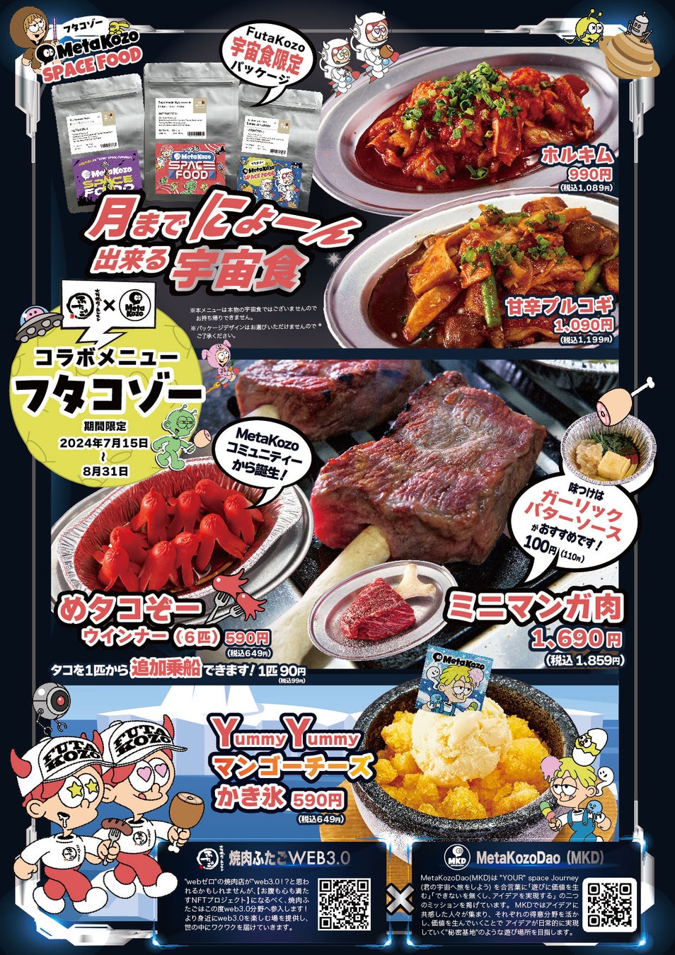 株式会社FTG Companyが運営する「大阪焼肉・ホルモン ふたご」は、「ワクワクする人を創り、ワクワクする社会を創る」をコンセプトにこの度Web3.0分野へ参入いたします。「現実世界とメタバースの境界線を無くし、ワクワクが止まらない世界を創造する」というミッションを掲げるMetaKozoとのコラボを通じて、世の中により沢山のワクワクを届けて参ります。今回のコラボメニューは宇宙船に乗ったタコ星人をモチーフにしたメニューや、宇宙で焼肉!?な焼肉宇宙食など、焼肉ふたごとMetaKozoの世界観を存分に楽しめるラインナップとなっております!