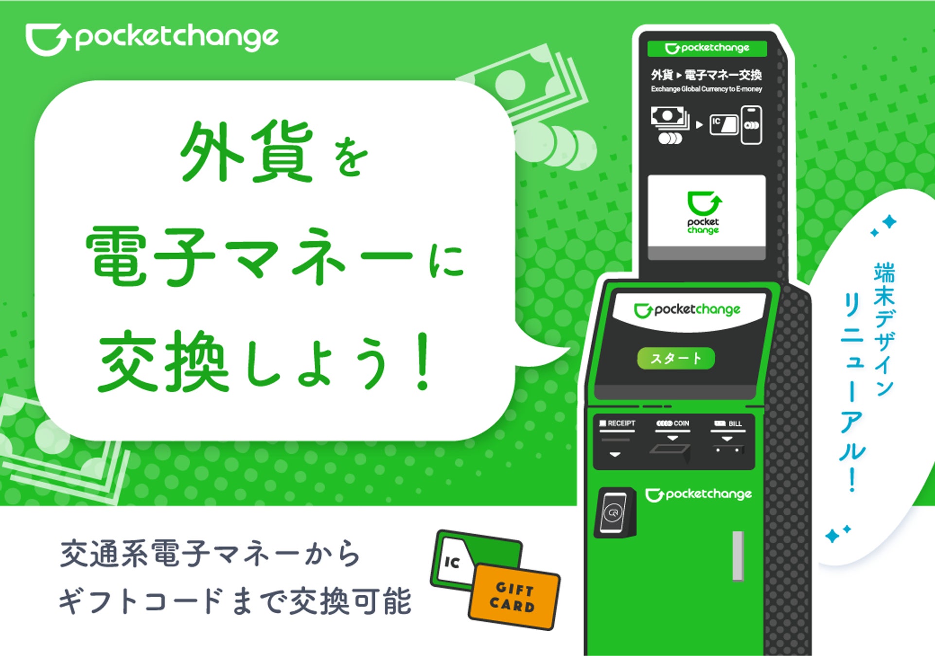 【端末デザインリニューアル!】新橋、高田馬場、所沢に新規設置!「Pocket Change」で家に眠っている外貨を電子マネーやギフトコードに交換しませんか?