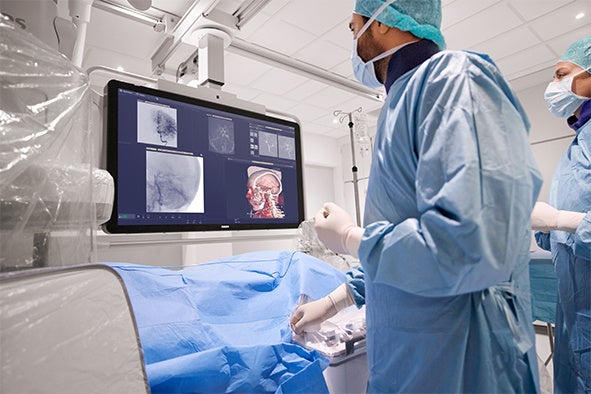 脳血管内治療で使われる血管撮影装置は、術者の技量や経験、人数に関わらず、短時間で確実に出血確認や梗塞部位を特定することが必要不可欠です。フィリップスでは、2024年4月から始まった「医師の働き方改革」の一助となれるよう、新しい血管撮影装置で作業効率を向上させることで医療従事者の負担を軽減し、診断CTレベルの高画質を提供することで診断・治療を迅速に高確度で行えるようサポートします。