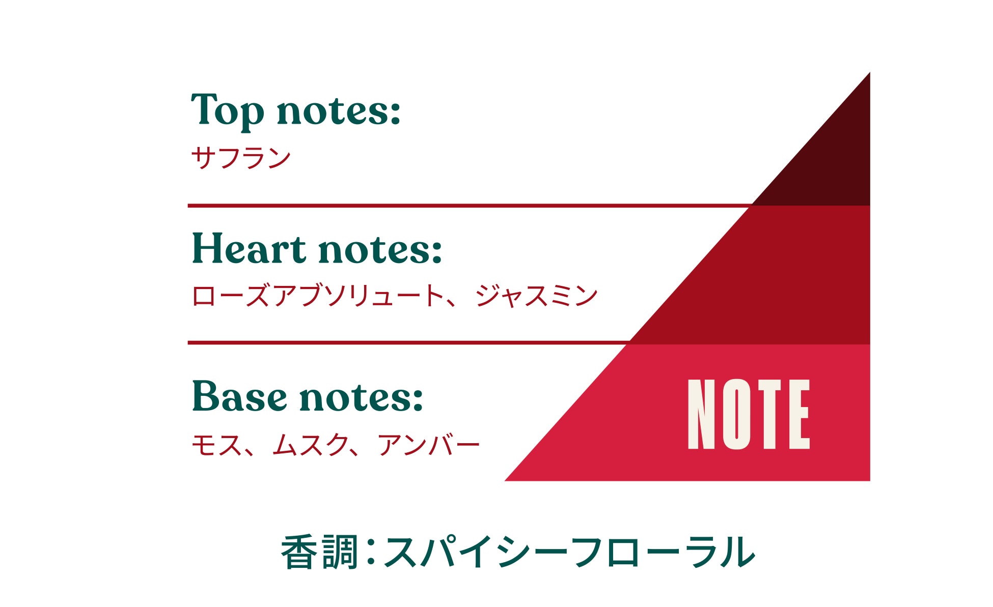 サフラン、ローズアブソリュート、ジャスミンやムスクをブレンドした、大胆で高揚感のある香りを存分に楽しめるフレグランス。長時間香りを楽しみたい方におすすめです。