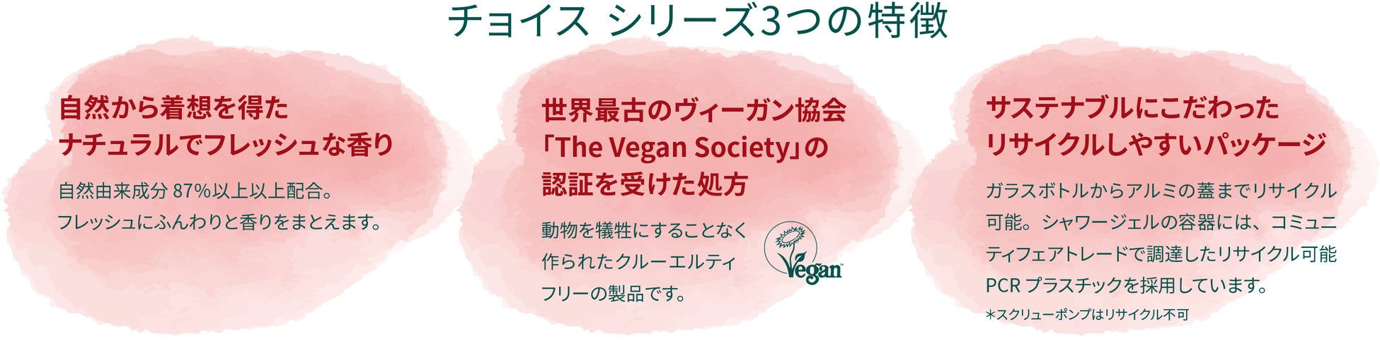 チョイスシリーズは、花々や果実などのナチュラルな香りで個性や魅力をエンパワーする、自己表現のために生まれたフレグランスシリーズ。鮮やかな香りが魅力で、全アイテムで自然由来成分87%以上を配合しています。