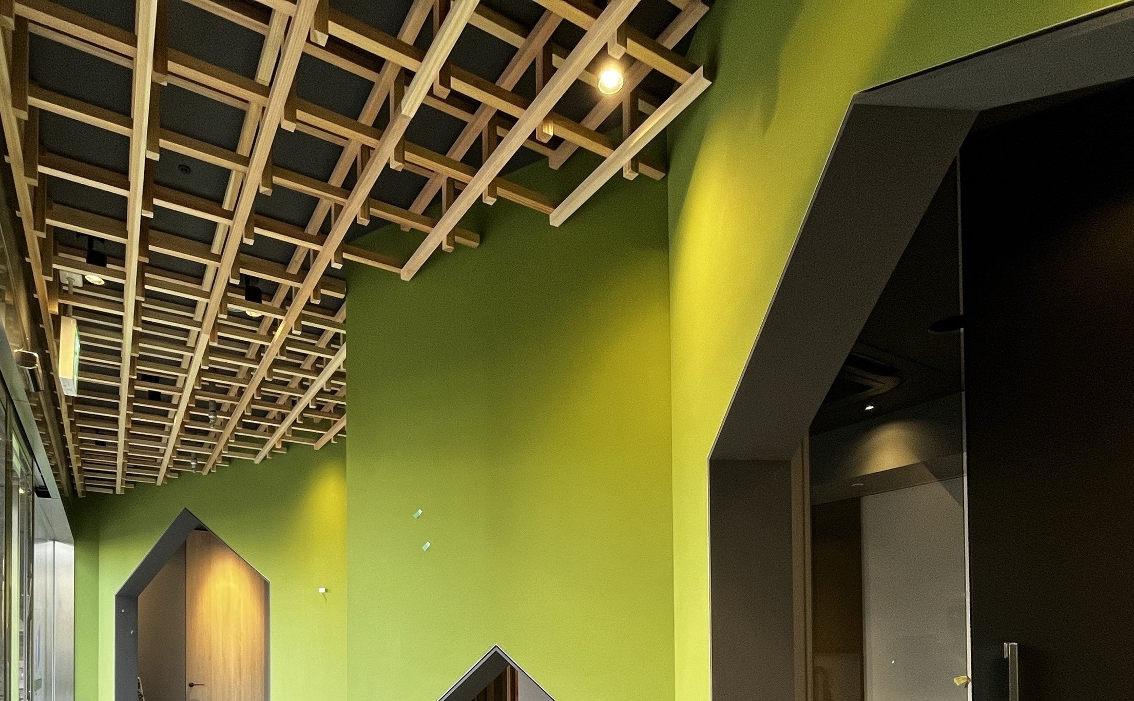 岡山無人ショールームの天井には、岡山の県木「アカマツ」が使用されています。壁面デザインには三角屋根の家のカタチを取り入れ、家と自然の共存を表現しました。「晴れの国(注2)」と呼ばれる岡山県らしい、晴れ晴れとした空間をイメージしたショールームです。