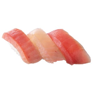 (左から)南まぐろ中とろ、びん長まぐろ、大切りまぐろの3貫セット。