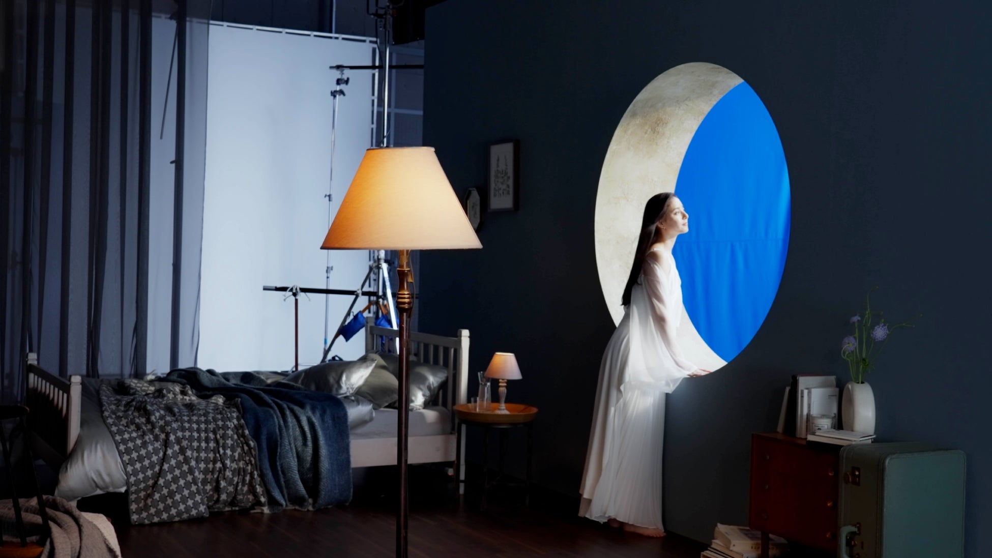 爽やかな笑顔で挨拶をしながら現場入りをした新木さん。撮影は、本商品の「ナイトタイムを有意義で贅沢な時間に。」というコンセプトをモチーフに、月のように見える形でデザインされた窓を設置するなど、世界観が表現された寝室風のセットが組まれました。白い衣装に身を包み、夜空を見上げる新木さんの仕草や表情に、現場では思わず「綺麗です!」と絶賛の声があがりました。ご自身で映像を確認する際には、スタッフと言葉を交わし、思わず笑みが溢れる場面も。