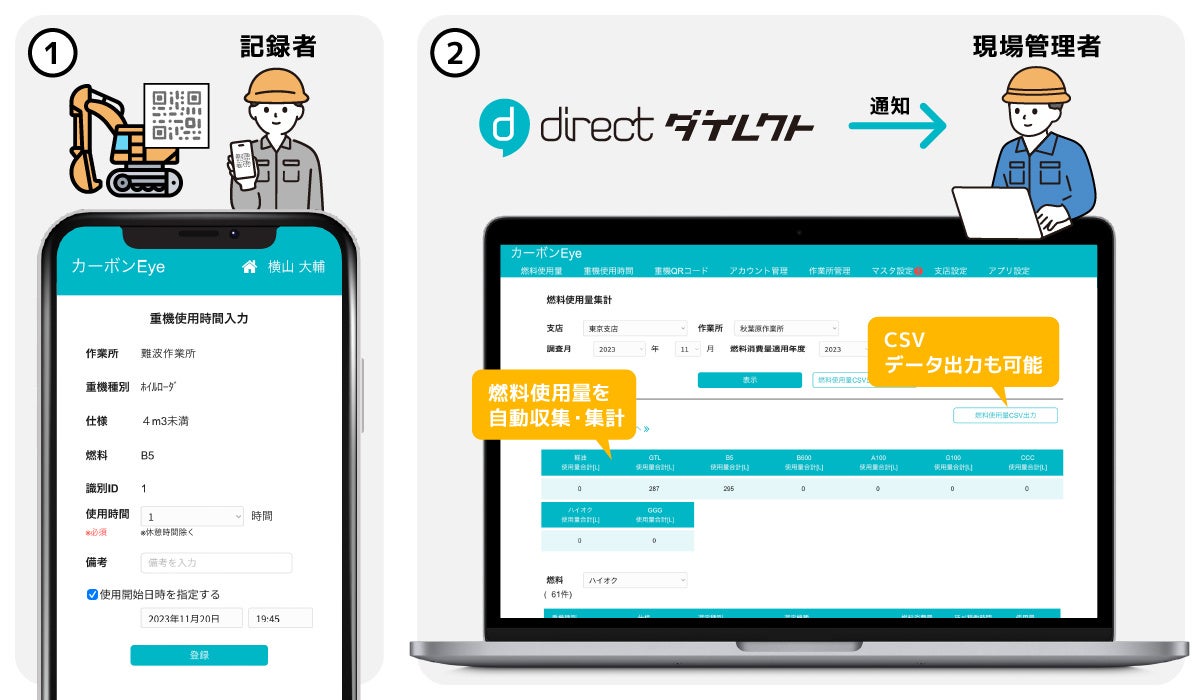 「カーボン Eye」は、スマートフォンとQRコードを用いて重機の燃料使用量を記録し、自動集計するソリューションです。L is Bが提供する現場向けビジネスチャット「direct」とも連携し、プッシュ通知からWebアプリに誘導します。