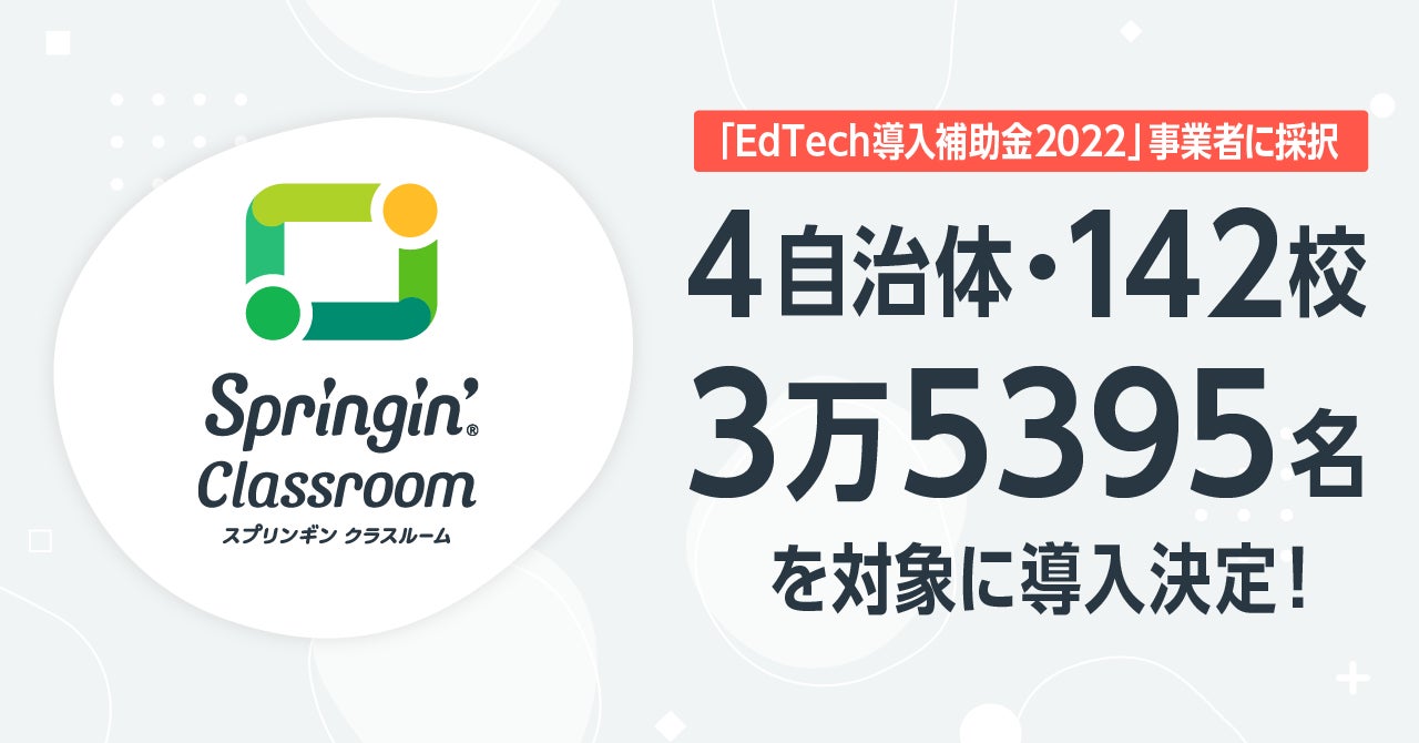 そして、経済産業省が実施する「EdTech導入補助金2022(以下、EdTech導入補助金)」の事業者採択が決定しました。事業者採択に伴い、EdTech導入補助金を利用したSpringin’ Classroomを、4つの自治体、142の小・中学校、特別支援学校の3万5,395名を対象に導入することが正式に決定いたしました。