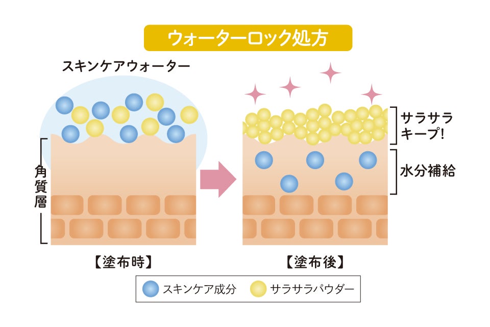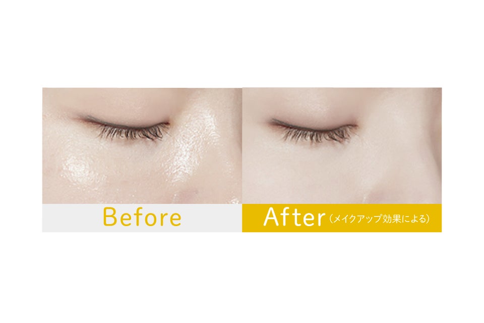 肌にのせた瞬間、ひんやりとしたスキンケアウォーターが肌*³に潤いを届けな がら、水分ロック。その後、微粒子サラサラパウダーのシリカが肌表面に残り、 皮脂吸着することでメイクをキープ。同時に毛穴やシワなど肌の凹凸をカ バーするブラーリング効果も。