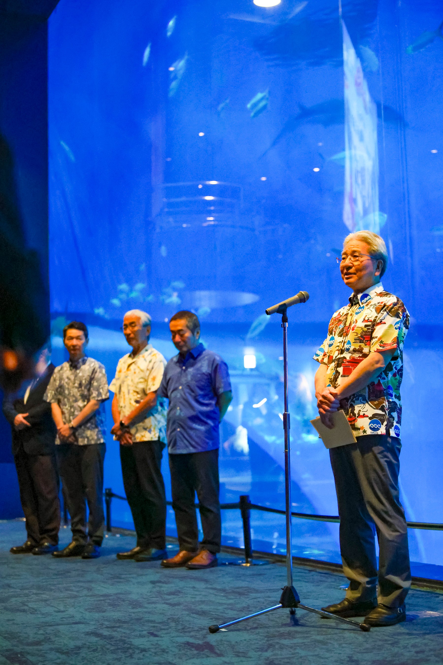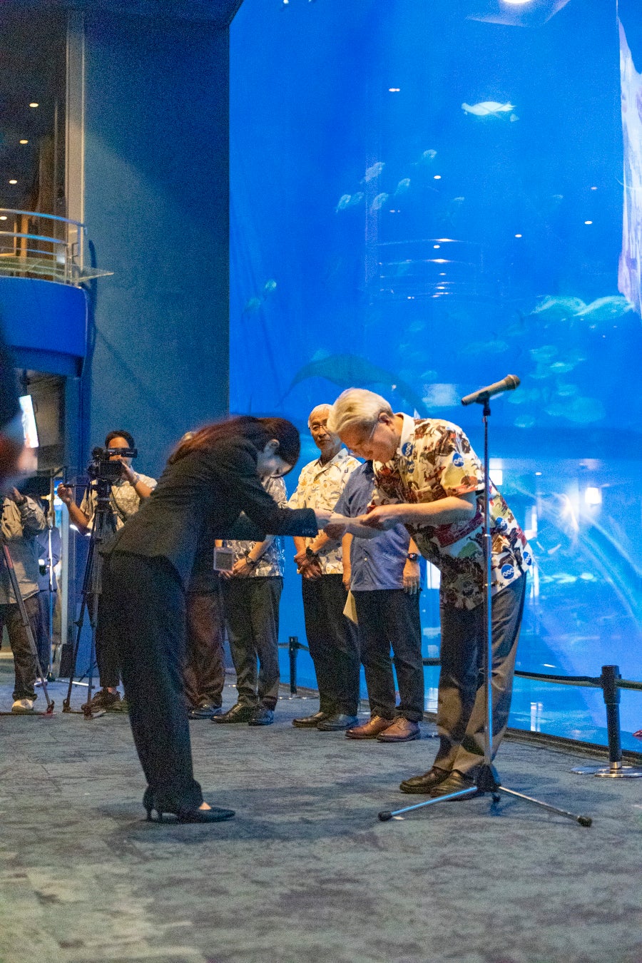 【(一財)沖縄美ら島財団】令和8年度 入社式を沖縄美ら海水族館「黒潮の海大水槽」で実施