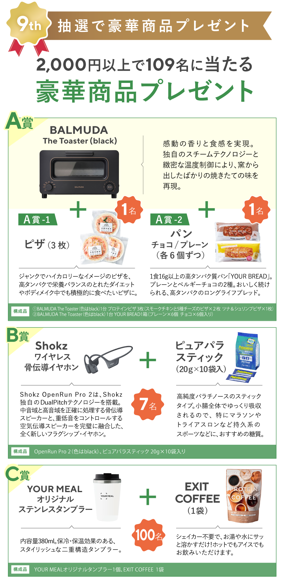 キャンペーン期間中、YOUR MEALが展開する公式オンラインサイトより税込2,000円以上ご購入で、A〜C賞いずれかに応募が可能です。