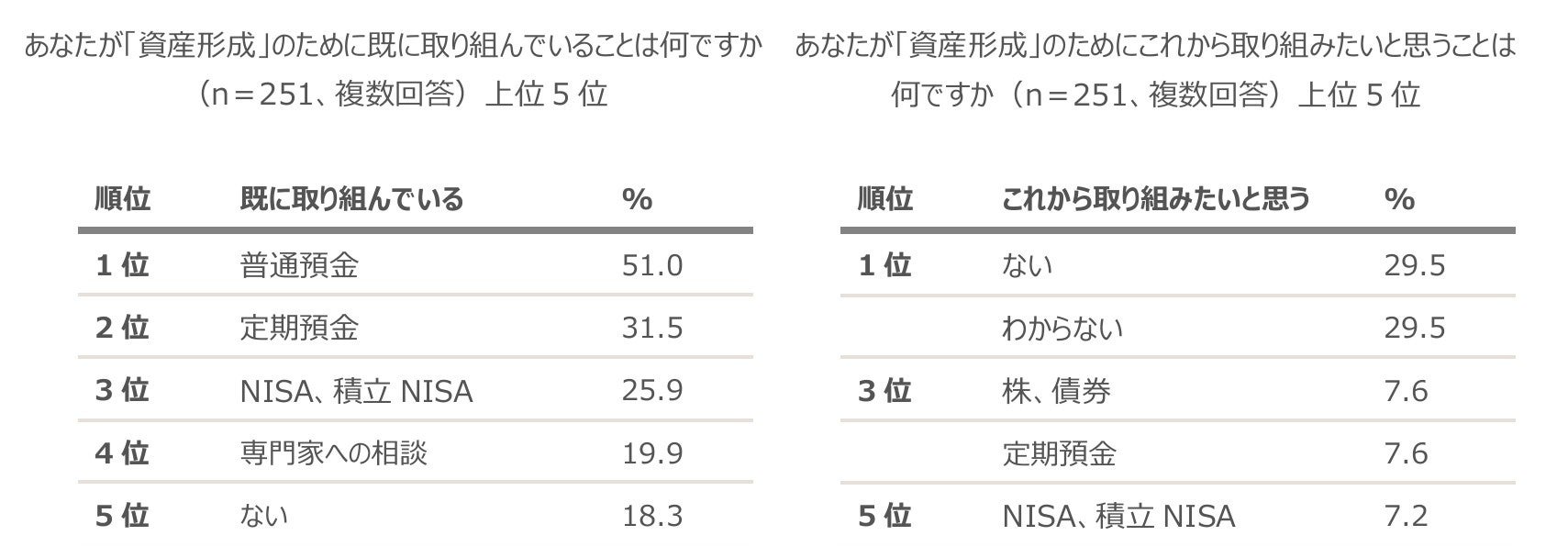 また、(既に取り組んでいること以外で)「資産形成」のためにこれから取り組みたいと思うことは何か聞いたところ、1位「ない」、「わからない」(各29.5%)、3位「株、債券」、「定期預金」(各7.6%)という結果でした。